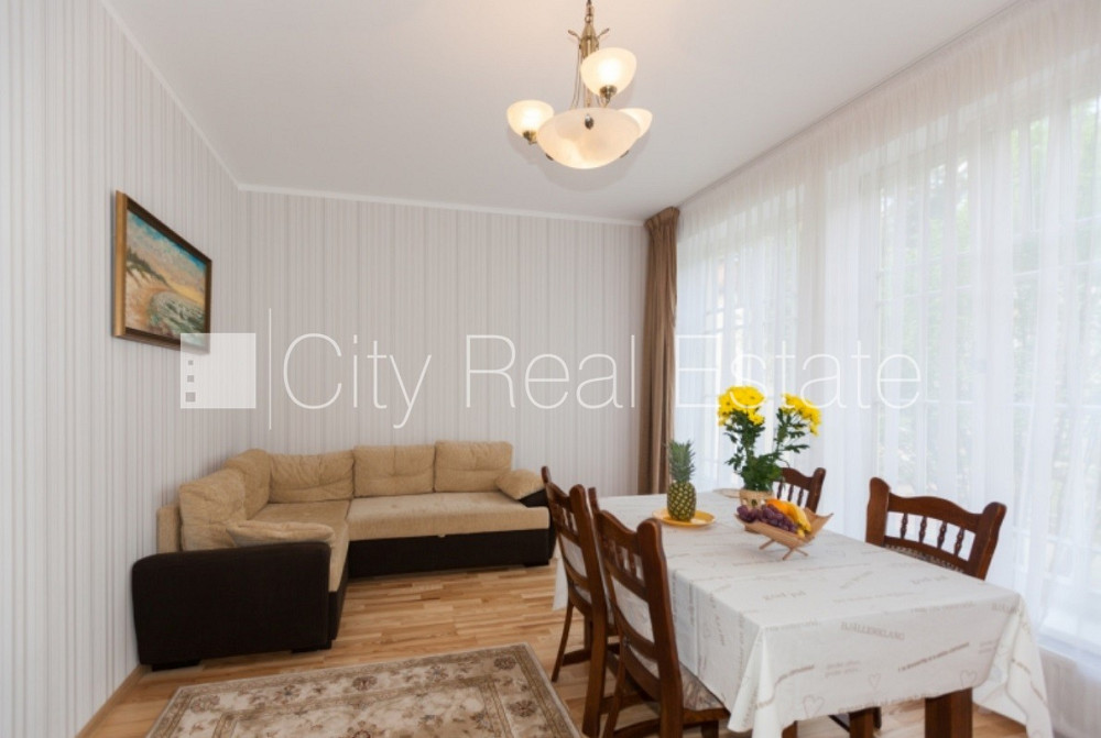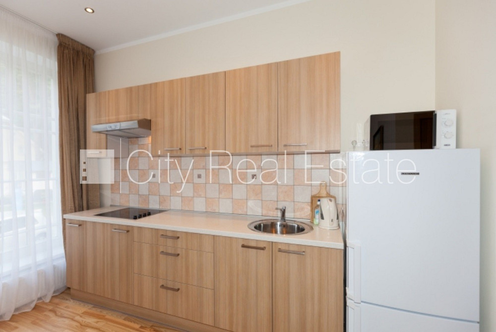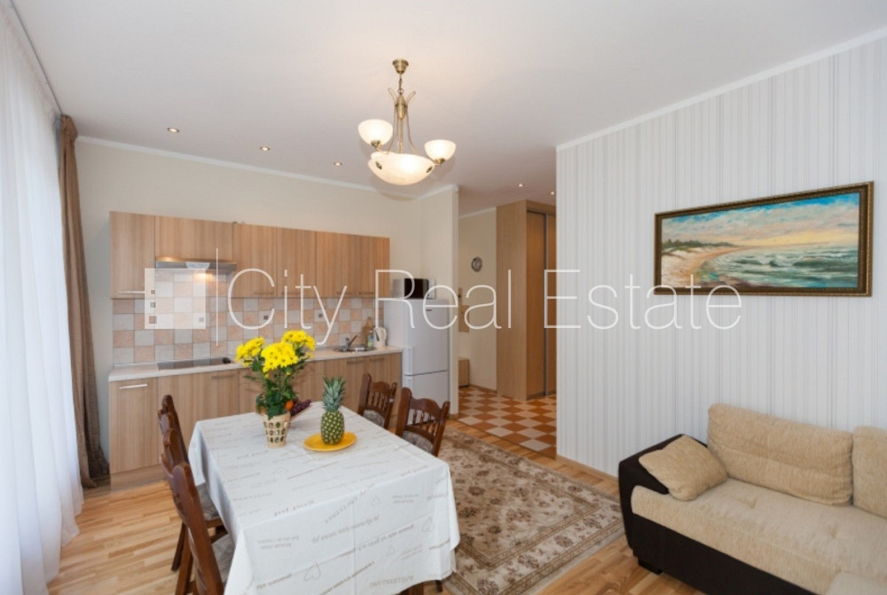 Labiekārtots apzaļumots pagalms, teritorijas iebrauktuves vārti aprīkoti ar automatizētu atvēršanās un aizvēršanās sistēmu, pazemes autostāvvieta, pagalmā bērnu spēļu laukums, istabas izolētas, studio tipa, virtuve apvienota ar istabu, gāzes apkure, boilers karstajam ūdenim, apsildāma grīda vannas istabā, lielie skatlogi, lamināta parketa grīda, sanitārais mezgls apvienots, dušas kabīne, iebūvēta virtuves iekārta, iebūvēti sienas skapji, izvelkamais stūra dīvāns, divguļamā gulta, galds, krēsli, ledusskapis, elektriskā plīts, veļas mašīna, kāpņu telpā koda atslēga, spilvens, segas, gultas veļa, trauki, uz 1 gadu, ar iespēju pagarināt līgumu, atbrīvots, līdz jūrai 400 m, slēdzot īres līgumu, Jums būs jāmaksā par pirmo īres mēnesi , kā arī jāiemaksā drošības depozīts viena mēneša īres maksas apmērā, CITY REAL ESTATE ID - 429596