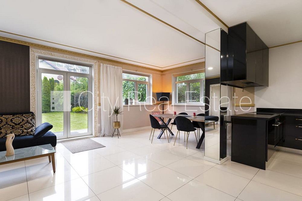 Privātmāja, fasāde ar dekoratīvo apmetumu, labiekārtots apzaļumots pagalms, garāža vienai automašīnai, garāžas vārti aprīkoti ar automatizētu atvēršanās un aizvēršanās sistēmu, pirmais stāvs ar dārzu, terase, plašs skats no loga, guļamistabu skaits 4 gab., studio tipa, virtuve apvienota ar viesistabu, augstie griesti, kamīns, siltumsūknis, jauna santehnika, iebūvēti gaismas ķermeņi, parketa grīda, flīžu grīdas segums, divi sanitārie mezgli, vanna, dušas kabīne, iebūvēta virtuves iekārta, iebūvēti sienas skapji, divguļamā gulta, ledusskapis, trauku mazgājamā mašīna, elektriskā plīts, cepeškrāsns, veļas mašīna, signalizācija, vietējā kanalizācija, spice, stratēģiski izdevīga vieta, CITY REAL ESTATE ID - 424365