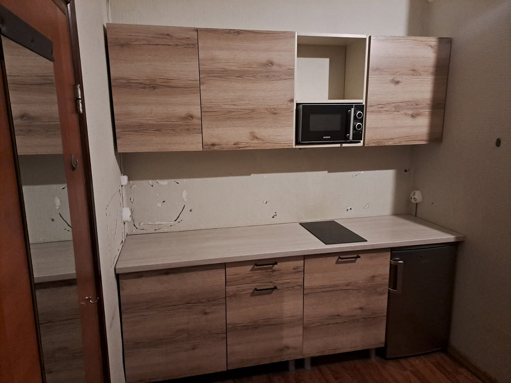 Малопользованный комплект кухонной мебели с техникой в отличном состоянии. Корпусы ящиков - ламинированная плита цвета отбеленного дуба. Рабочая поверхность - ламинированная плита цвета отбеленной ольхи. Регулируемые ножки 12 см.