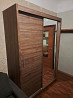 2 durvju skapis ar bīdāmām durvīm un spoguli, tumšs rieksts, lamināts. 2160X1510x610 mm. Iekšā stanga un plaukti.