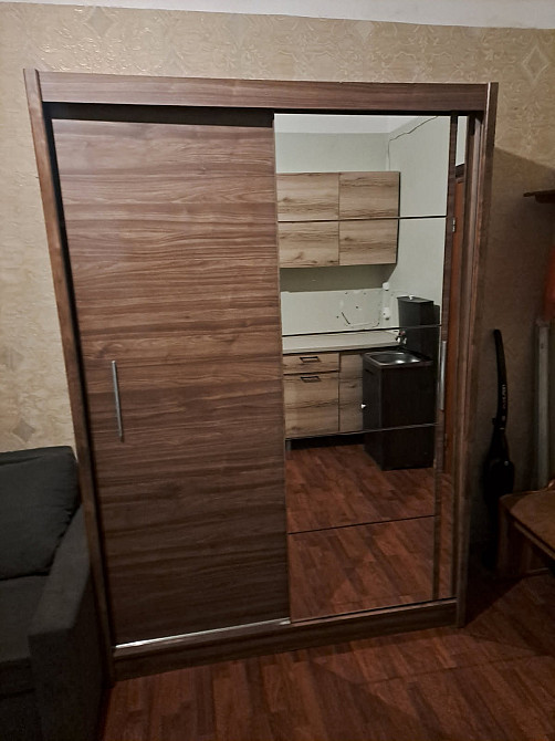 2 durvju skapis ar bīdāmām durvīm un spoguli, tumšs rieksts, lamināts. 2160X1510x610 mm. Iekšā...