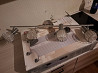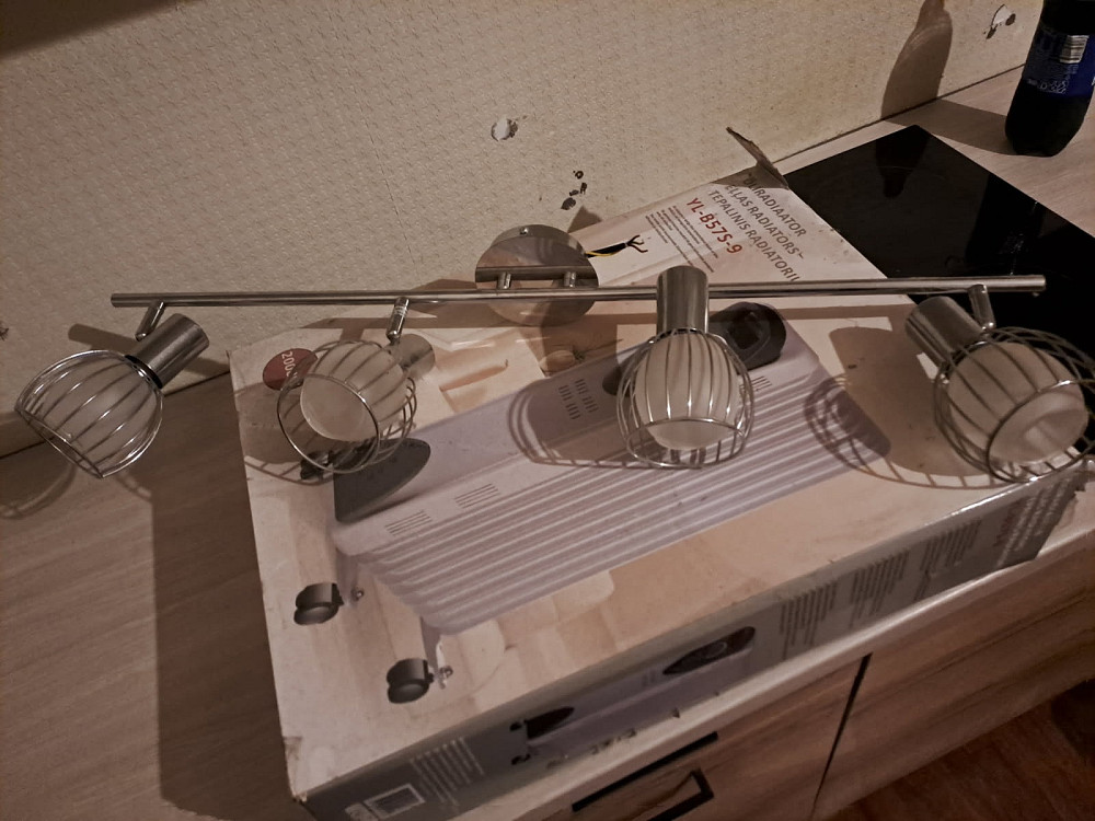 Небольшая люстра в рабочем состоянии с 4 работающими лампами типа G9. Серебристого цвета.