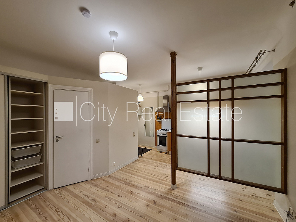Pagalma māja, labiekārtots apzaļumots pagalms, slēgta teritorija, iespēja nomāt autostāvvietu, ieeja no pagalma, logi vērsti uz pagalma pusi, studio tipa, virtuve apvienota ar istabu, centrālā apkure, plastikāta stikla pakešu logi, metāla durvis, koka dēļu grīdas segums, sanitārais mezgls apvienots, dušas kabīne, iebūvēta virtuves iekārta, iebūvēti sienas skapji, gāzes plīts, veļas mašīna, kāpņu telpā koda atslēga, atbrīvots, izvēloties šo īpašumu, komisijas maksa par starpniecības pakalpojumiem ir vienāda ar vienu pusi (50%) no šī īpašuma viena mēneša īres maksas, CITY REAL ESTATE ID - 493165