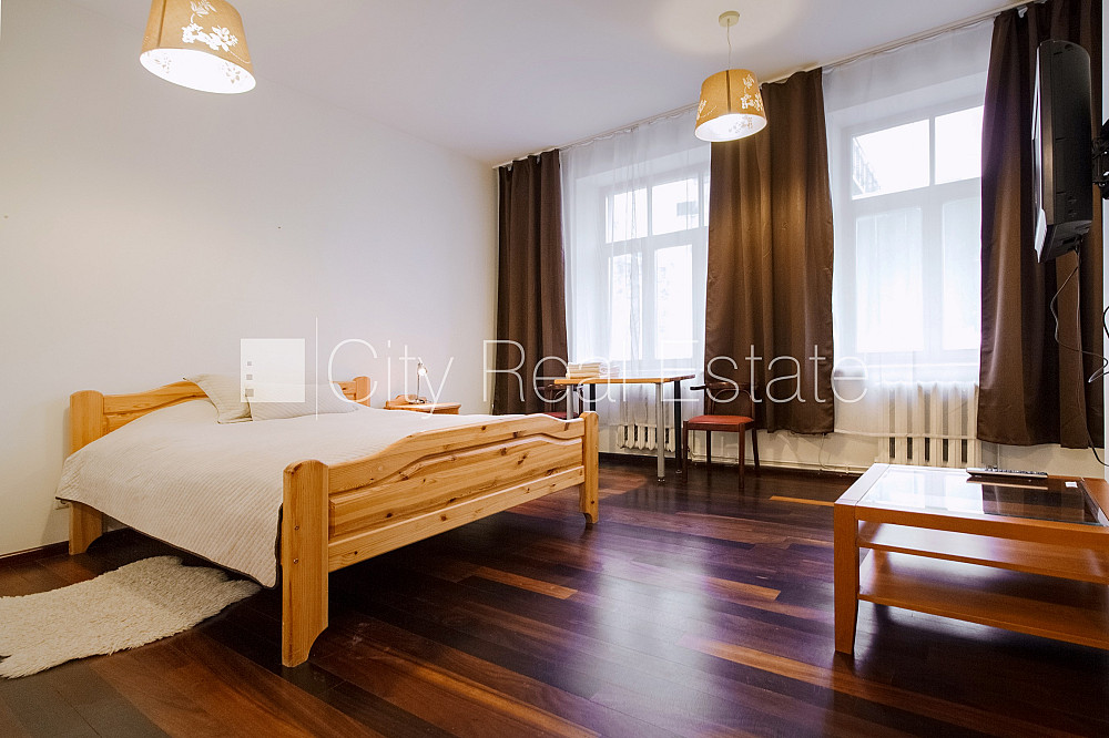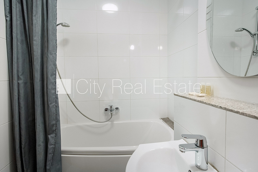 Pagalma māja, slēgts pagalms, objektu apsargā fiziskā apsardze, ieeja no pagalma, pagalmā bērnu spēļu laukums, ir lifts, studio tipa, virtuve apvienota ar istabu, palīgtelpa, augstie griesti, centrālā apkure, pilnā apdare, koka stikla pakešu logi, lamināta parketa grīda, flīžu grīdas segums, sanitārais mezgls apvienots, vanna, iebūvēta virtuves iekārta, iebūvēti sienas skapji, divguļamā gulta, galds, virtuves galds, žurnālu galdiņš, krēsli, virtuves krēsli, televizors, ledusskapis, trauku mazgājamā mašīna, cepeškrāsns, gāzes plīts, tvaika nosūcējs, internets, kabeļtelevīzija, slēdzot īres līgumu, Jums būs jāmaksā par pirmo īres mēnesi , kā arī jāiemaksā drošības depozīts viena mēneša īres maksas apmērā, CITY REAL ESTATE ID - 426070