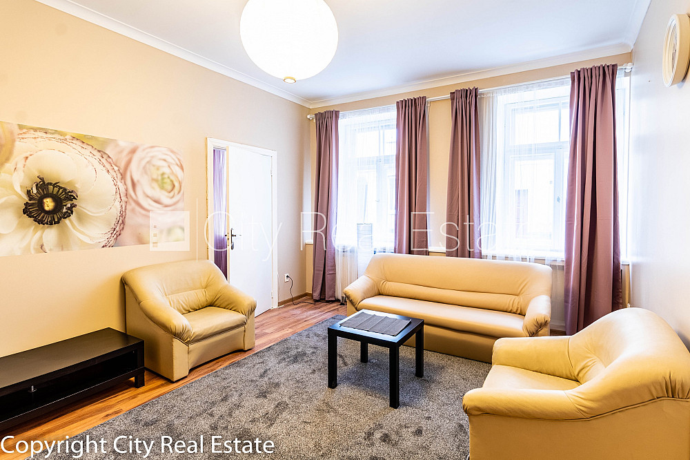 Pagalma māja, slēgts pagalms, ieeja no pagalma, logi vērsti uz pagalma pusi, guļamistabu skaits 2 gab., virtuve, centrālā apkure, pilnā apdare, restaurēti, atjaunoti koka logi, jauna santehnika, sanitārais mezgls apvienots, dušas kabīne, iebūvēta virtuves iekārta, iebūvēti sienas skapji, gulta , divguļamā gulta, galds, žurnālu galdiņš, krēsli, atpūtas krēsli, trīsvietīgais atpūtas krēsls, kumode, ledusskapis, gāzes plīts, tvaika nosūcējs, veļas mašīna, internets, kabeļtelevīzija, diennakts videonovērošana, kāpņu telpā koda atslēga, uz 1 gadu, ar iespēju pagarināt līgumu, līdz trīs personām, atbrīvots, bez bērniem, bez dzīvniekiem, slēdzot īres līgumu, Jums būs jāmaksā par pirmo īres mēnesi , kā arī jāiemaksā drošības depozīts, izvēloties šo īpašumu, komisijas maksa par starpniecības pakalpojumiem ir vienāda ar vienu pusi (50%) no šī īpašuma viena mēneša īres maksas, CITY REAL ESTATE ID - 424418