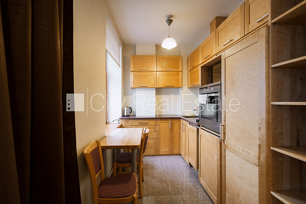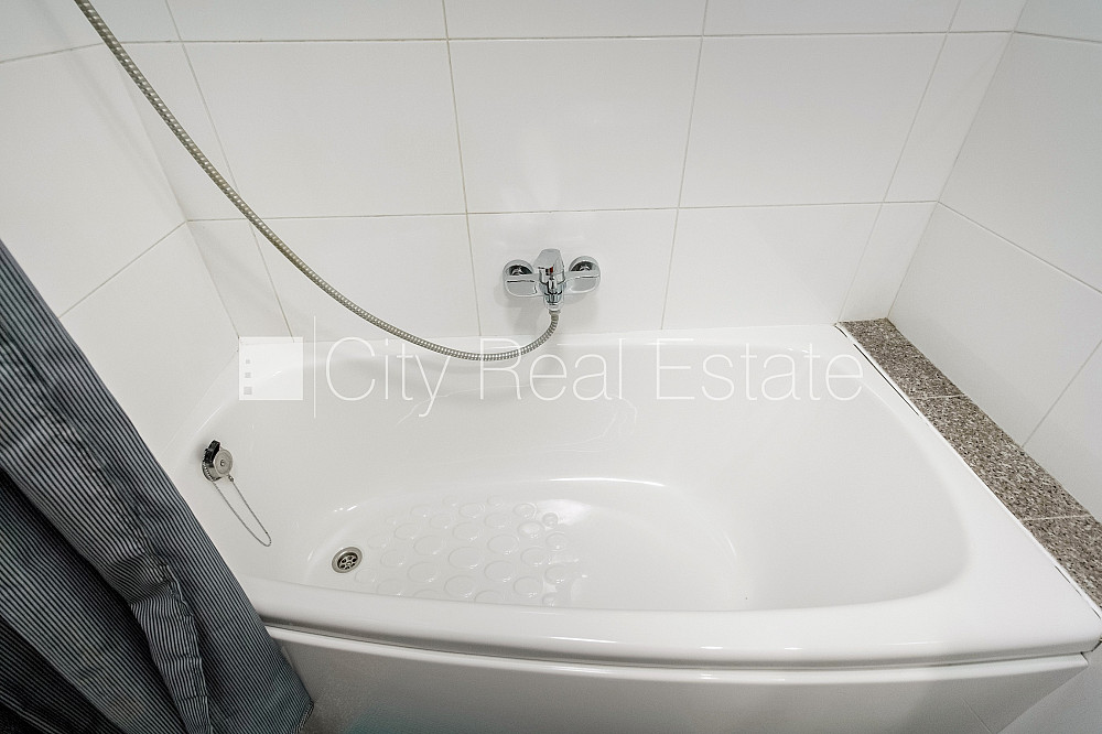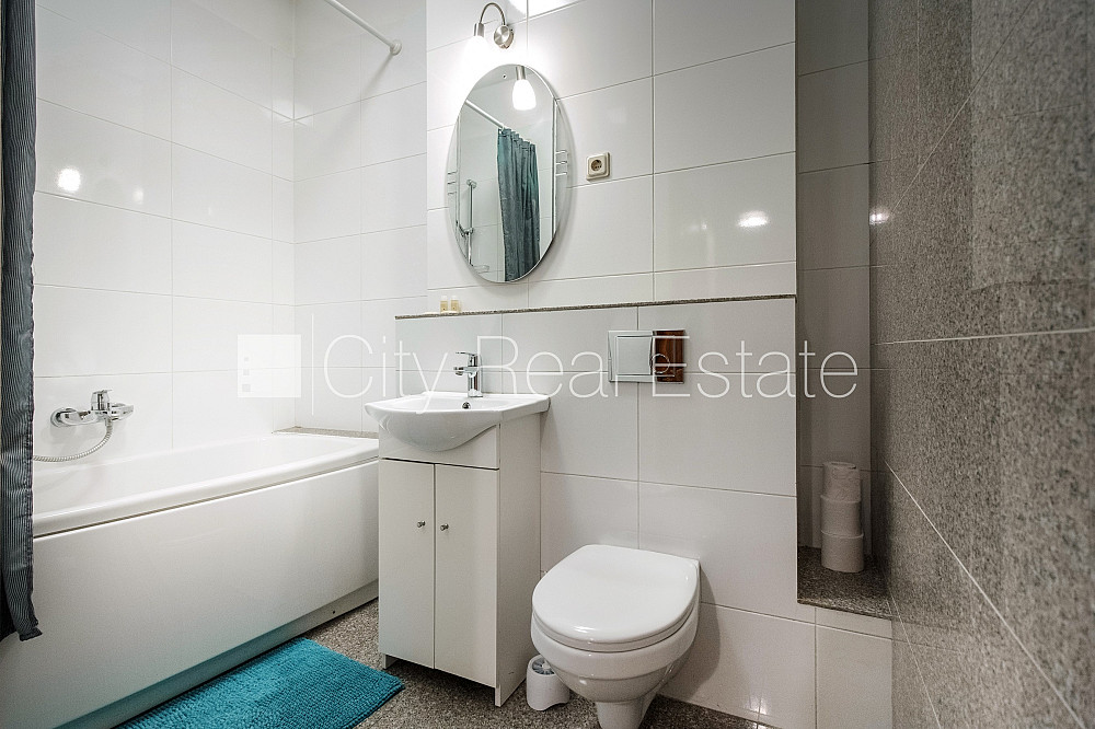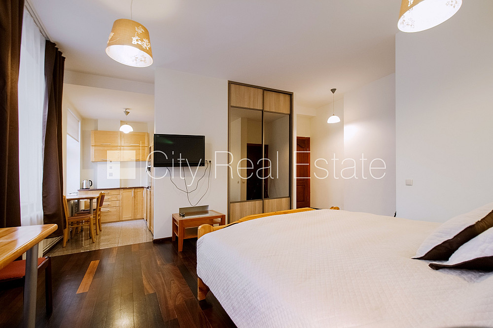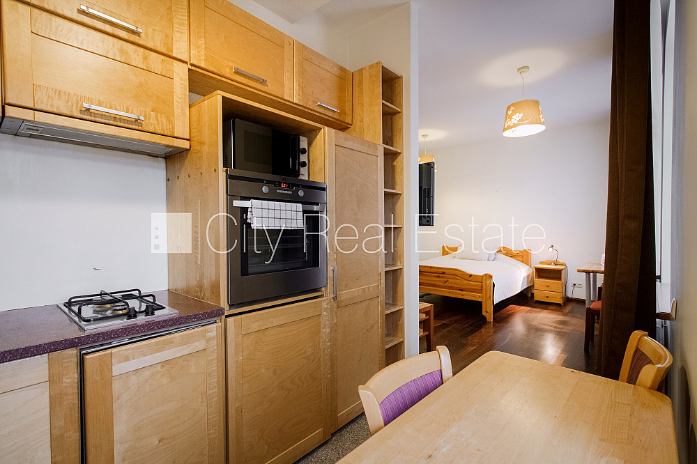 Šo dzīvokli izīrē pa diennaktīm (īstermiņa īre), īres cena sludinājumā norādīta par vienu diennakts īri. Pagalma māja, slēgts pagalms, objektu apsargā fiziskā apsardze, ieeja no pagalma, pagalmā bērnu spēļu laukums, ir lifts, studio tipa, virtuve apvienota ar istabu, palīgtelpa, augstie griesti, centrālā apkure, pilnā apdare, koka stikla pakešu logi, lamināta parketa grīda, flīžu grīdas segums, sanitārais mezgls apvienots, vanna, iebūvēta virtuves iekārta, iebūvēti sienas skapji, divguļamā gulta, galds, virtuves galds, žurnālu galdiņš, krēsli, virtuves krēsli, televizors, ledusskapis, trauku mazgājamā mašīna, cepeškrāsns, gāzes plīts, tvaika nosūcējs, internets, kabeļtelevīzija, CITY REAL ESTATE ID - 510399