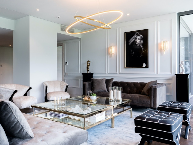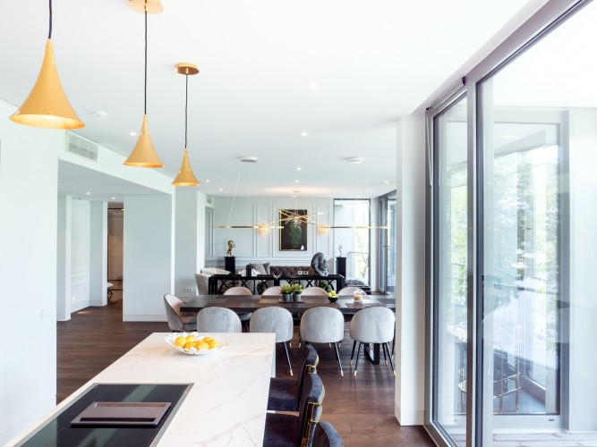 No šī valdzinošā dzīvokļa plašajiem logiem paveras elpu aizraujošs skats uz upi un Vecrīgu, nodrošinot lielisku fonu atpūtai un spēku atjaunošanai. Mūsdienīgi klasiskais interjers ir gan stilīgs, gan ērts, ar augstākās klases apdari un klasiskiem elementiem. Atvērtā plānojuma virtuve un dzīvojamā istaba ar kopējo platību 100 m2, pārpludinās telpu ar dabisko gaismu, izceļot skaisto upes un pilsētas skatu. Ar 4 guļamistabām un 3 vannas istabām, būs pietiekami daudz vietas plašai ģimenei. Saimnieku guļamistabā ir plaša garderobe un privāta vannas istaba, kur guļot vannā varēsiet baudīt skaistu skatu uz Vecrīgu. Dzīvokļa 6 balkoni nodrošinās arī plašu ārtelpu. Dzīvoklim ir veļas un saimniecības telpa. Dzīvoklis aprīkots ar augstas klases mēbelēm. Dzīvokļa tuvumā atrodas vairāki parki un zaļās zonas pastaigām. Rīgas centrs atrodas tikai 10 minūšu gājiena vai 5 minūšu brauciena attālumā. Dzīvoklis tiek izīrēts kopā ar 4 autostāvvietām un noliktavas telpu. Blakus ēkai ir pat vieta, kur turēt savu jahtu. Dzīvokļa plānojums- ar virtuvi apvienota plaša dzīvojamā istaba ar 4 balkoniem. Saimnieku guļamistaba ar plašu garderobi un vannas istabu, kā arī balkonu, pretējā pusē ir divas guļamistabas bērniem ar kopēju vannas istabu. Kā arī papildus viesu guļamistaba ar privātu vannas istabu, kā arī viesu tualete un veļas telpa ar atsevišķu ieeju personālam. Dzīvokļa kopējā platība 286m2, ar 240m2 dzīvojamo platību un 46m2 balkoniem. Dzīvoklī ir moderna ventilācijas sistēma un kondicionieri, kas ļaus izveidot ideālu mikroklimatu. Mūsdienīgi, klusi lifti un konsjeržs un video skatīšanās. Viens dzīvoklis stāvā ļaus baudīt izteiktu privātumu.
