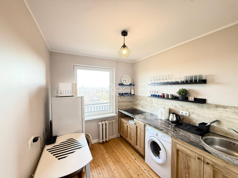 Fasādes māja, labiekārtota apzaļumota teritorija, ieeja no ielas, teritorijas stāvlaukums noklāts ar asfaltbetona segumu , ir lifts, balkons 6 m2, plašs skats no loga, guļamistabu skaits 1 gab., istabas izolētas 2 gab., virtuve, halle, centrālā apkure, pilnā apdare, lielais skatlogs, plastikāta stikla pakešu logi, metāla durvis, izlīdzinātas sienas, izlīmētas tapetes, jauna santehnika, koka dēļu grīdas segums, flīžu grīdas segums, sanitārais mezgls atsevišķs, vanna, iebūvēta virtuves iekārta, dīvāns, divguļamā gulta, virtuves galds, žurnālu galdiņš, skapis, ledusskapis, elektriskā plīts, veļas mašīna, atbrīvots, stratēģiski izdevīga vieta, līdz veikalam 50 m, līdz trolejbusa pieturai 100 m, CITY REAL ESTATE ID - 426757
