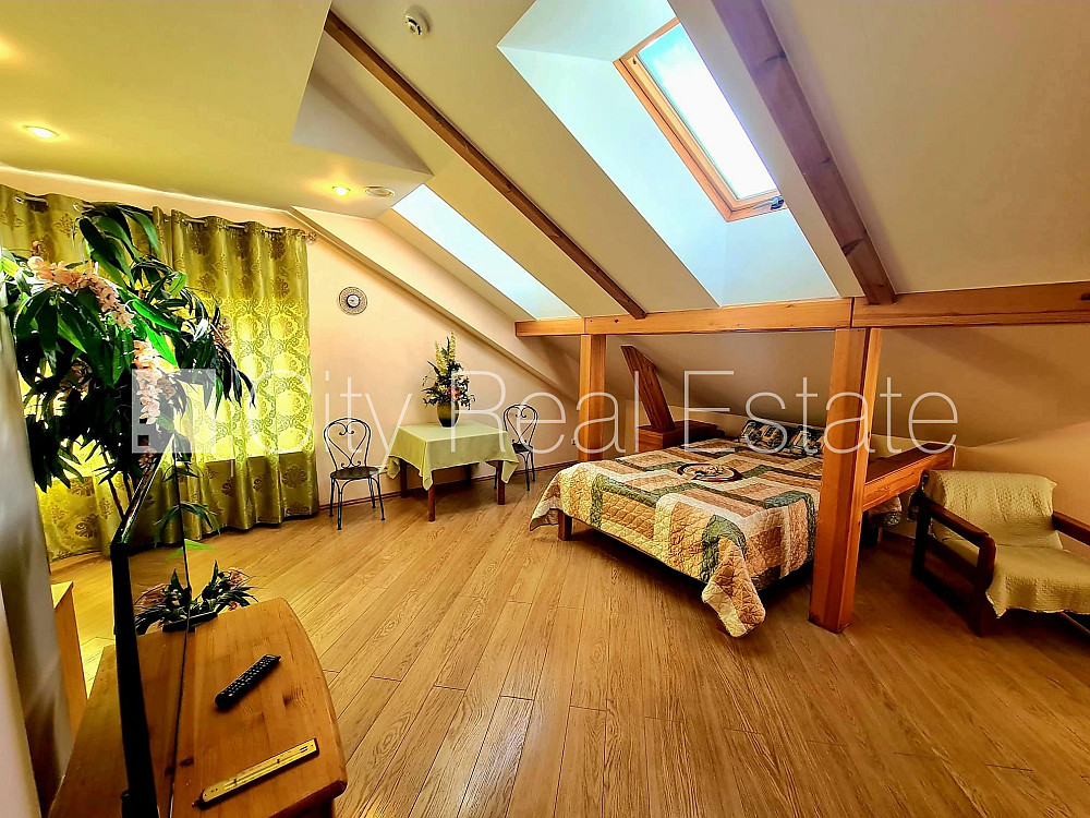 Fasādes māja, labiekārtots apzaļumots pagalms, slēgts pagalms, iežogota teritorija, maksas stāvvieta, vieta automašīnai, kāpņu telpa pēc kapitālā remonta, studio tipa, virtuve apvienota ar istabu, dārza kamīns, gāzes apkure, pilnā apdare, jumta logi, sanitārais mezgls apvienots, stūra vanna, iebūvēta virtuves iekārta, divguļamā gulta, galds, televizors, ledusskapis, elektriskā plīts, mikroviļņu krāsns, veļas mašīna, iespējama telpu uzkopšana, izīrē ar visu bildēs redzamo aprīkojumu, spilveni, segas, gultas veļa, CITY REAL ESTATE ID - 432674