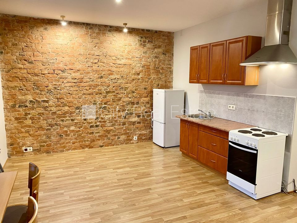 Fasādes māja, renovēta māja, labiekārtots apzaļumots pagalms, slēgts pagalms, ieeja no ielas, kāpņu telpa pēc kapitālā remonta, logi vērsti uz pagalma pusi, studio tipa, virtuve apvienota ar istabu, augstie griesti, centrālā apkure, pilnā apdare, plastikāta stikla pakešu logi, krāsotas sienas, jauna santehnika, lamināta parketa grīda, flīžu grīdas segums, sanitārais mezgls apvienots, dušas kabīne, tualete, iebūvēta virtuves iekārta, dīvāns, virtuves galds, krēsli, ledusskapis, elektriskā plīts, cepeškrāsns, tvaika nosūcējs, veļas mašīna, kāpņu telpā koda atslēga, izīrē ar visu bildēs redzamo aprīkojumu, uz 1 gadu, ar iespēju pagarināt līgumu, atbrīvots, bez dzīvniekiem, slēdzot īres līgumu, Jums būs jāmaksā par pirmo īres mēnesi , kā arī jāiemaksā drošības depozīts viena mēneša īres maksas apmērā, izvēloties šo īpašumu, komisijas maksa par starpniecības pakalpojumiem ir vienāda ar vienu pusi (50%) no šī īpašuma viena mēneša īres maksas, CITY REAL ESTATE ID - 504240