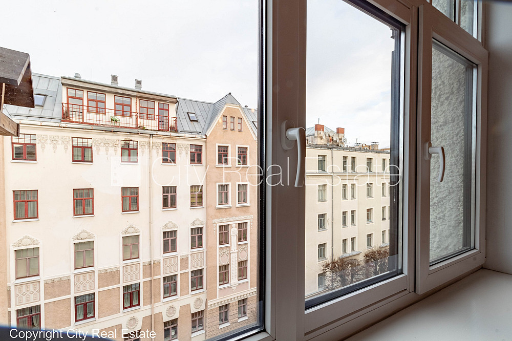 Fasādes māja, renovēta māja, vieta automašīnai, apsargāta autostāvvieta, apsargāts pagalms, ieeja no ielas un pagalma, ir lifts, logi vērsti mājas abās pusēs, istabas izolētas, studio tipa, virtuve apvienota ar istabu, mainīti radiatori, centrālā apkure, apsildāma grīda tualetē, apsildāma grīda vannas istabā, plastikāta stikla pakešu logi, jauna santehnika, parketa grīda, flīžu grīdas segums, divi sanitārie mezgli, vanna, dušas kabīne, bidē, iebūvēta virtuves iekārta, iebūvēti sienas skapji, ledusskapis, saldētava, trauku mazgājamā mašīna, elektriskā plīts, cepeškrāsns, internets, kabeļtelevīzija, diennakts videonovērošana, video domofons, slēgta kāpņu telpa, izīrē ar visu bildēs redzamo aprīkojumu, uz 1 gadu, uz 2 gadiem, uz 3 gadiem, ar iespēju pagarināt līgumu, atbrīvots, stratēģiski izdevīga vieta, slēdzot īres līgumu, Jums būs jāmaksā par pirmo īres mēnesi , kā arī jāiemaksā drošības depozīts, komisijas maksa par starpniecības pakalpojumiem nav jāmaksā, CITY REAL ESTATE ID - 433704