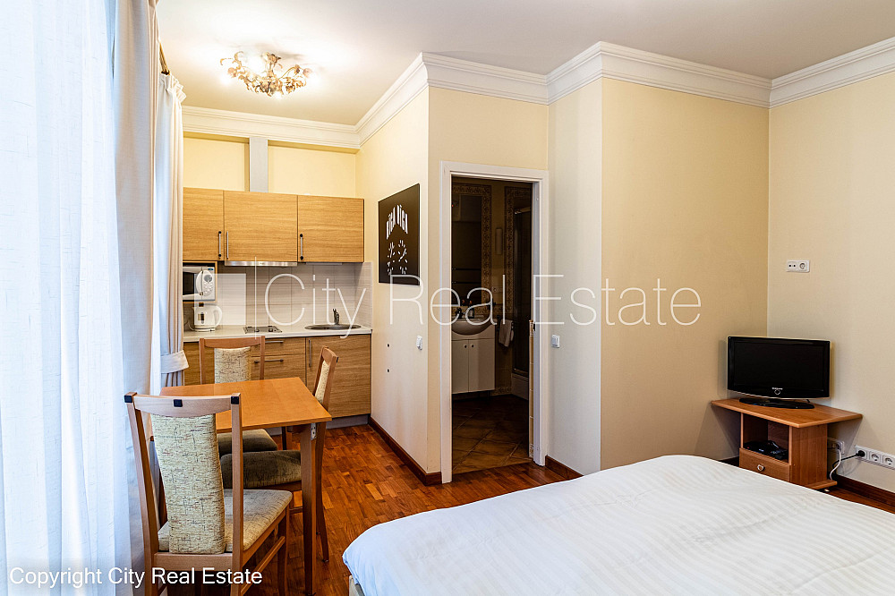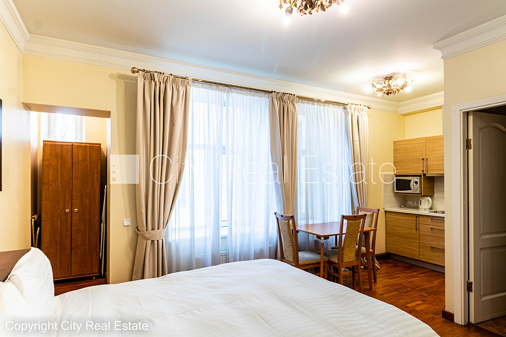 Fasādes māja, renovēta māja, ieeja no ielas, kāpņu telpa pēc kapitālā remonta, logi vērsti uz pagalma pusi, studio tipa, virtuve apvienota ar istabu, augstie griesti, gāzes apkure, boilers karstajam ūdenim, pilnā apdare, plastikāta stikla pakešu logi, krāsotas sienas, jauna santehnika, lamināta parketa grīda, flīžu grīdas segums, sanitārais mezgls apvienots, dušas kabīne, tualete, iebūvēta virtuves iekārta, gulta , virtuves galds, krēsli, skapis, televizors, ledusskapis, elektriskā plīts, tvaika nosūcējs, veļas mašīna, slēgta kāpņu telpa, izīrē ar visu bildēs redzamo aprīkojumu, atbrīvots, slēdzot īres līgumu, Jums būs jāmaksā par pirmo īres mēnesi , kā arī jāiemaksā drošības depozīts viena mēneša īres maksas apmērā, izvēloties šo īpašumu, komisijas maksa par starpniecības pakalpojumiem ir vienāda ar vienu pusi (50%) no šī īpašuma viena mēneša īres maksas, CITY REAL ESTATE ID - 507681