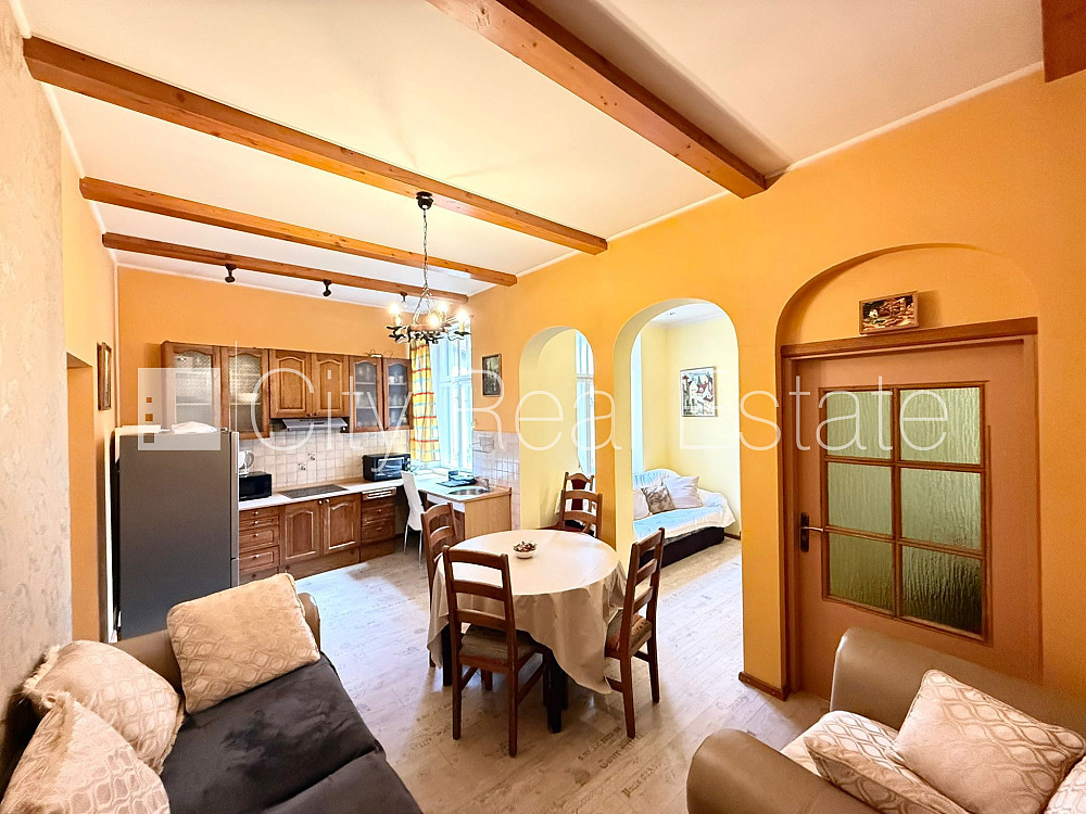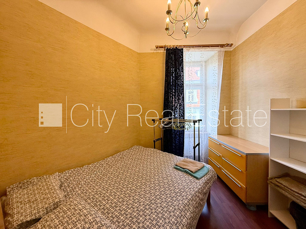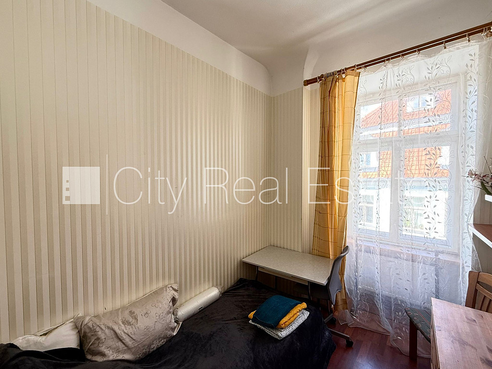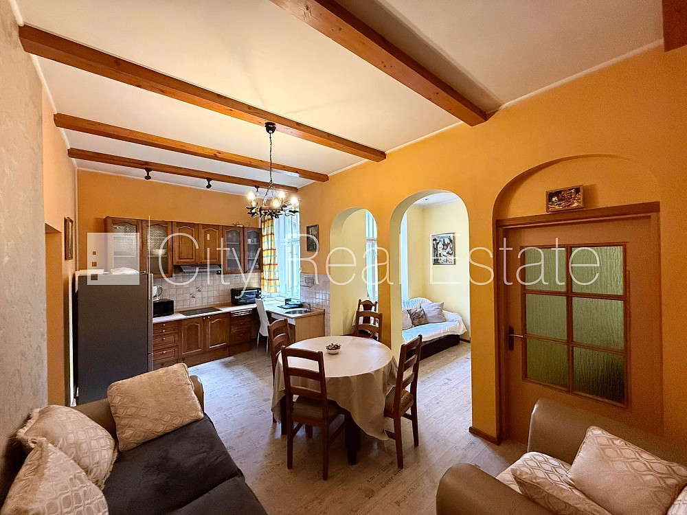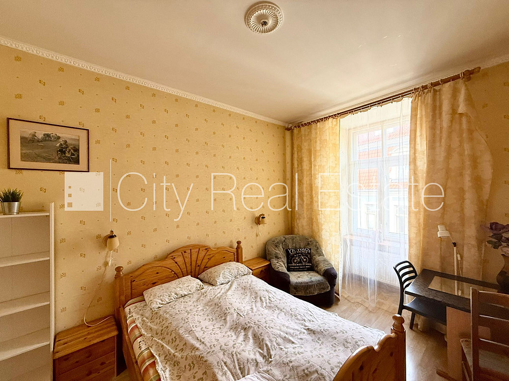 Fasādes māja, renovēta māja, ieeja no ielas, kāpņu telpa pēc kosmētiskā remonta, logi vērsti mājas abās pusēs, guļamistabu skaits 5 gab., studio tipa, virtuve apvienota ar viesistabu, halle, augstie griesti, mainīti radiatori, gāzes apkure, plastikāta stikla pakešu logi, metāla durvis, krāsotas sienas, mainīta santehnika, lamināta parketa grīda, flīžu grīdas segums, sanitārais mezgls atsevišķs, vanna, dušas kabīne, iebūvēta virtuves iekārta, dīvāns, gulta , divguļamā gulta, galds, krēsli, skapis, kumode, televizors, ledusskapis, elektriskā plīts, tvaika nosūcējs, mikroviļņu krāsns, veļas mašīna, internets, kāpņu telpā koda atslēga, izīrē ar visu bildēs redzamo aprīkojumu, gultas veļa, trauki, uz četriem mēnešiem, uz pieciem mēnešiem, uz sešiem mēnešiem, uz 1 gadu, atbrīvo janvārī, stratēģiski izdevīga vieta, CITY REAL ESTATE ID - 428412
