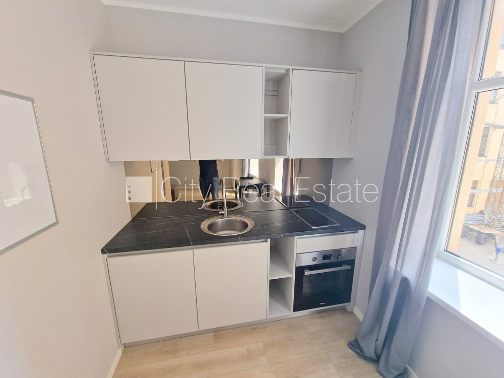 Fasādes māja, renovēta māja, slēgts pagalms, ieeja no ielas un pagalma, kāpņu telpa pēc kapitālā remonta, logi vērsti uz pagalma pusi, studio tipa, virtuve apvienota ar istabu, augstie griesti, centrālā apkure, pilnā apdare, plastikāta stikla pakešu logi, krāsotas sienas, jauna santehnika, lamināta parketa grīda, flīžu grīdas segums, sanitārais mezgls apvienots, dušas kabīne, tualete, iebūvēta virtuves iekārta, izvelkamais stūra dīvāns, virtuves galds, krēsli, skapis, ledusskapis, elektriskā plīts, cepeškrāsns, tvaika nosūcējs, veļas mašīna, diennakts videonovērošana, izīrē ar visu bildēs redzamo aprīkojumu, uz 1 gadu, uz 2 gadiem, atbrīvots, slēdzot īres līgumu, Jums būs jāmaksā par pirmo īres mēnesi , kā arī jāiemaksā drošības depozīts viena mēneša īres maksas apmērā, izvēloties šo īpašumu, komisijas maksa par starpniecības pakalpojumiem ir vienāda ar vienu pusi (50%) no šī īpašuma viena mēneša īres maksas, CITY REAL ESTATE ID - 516618