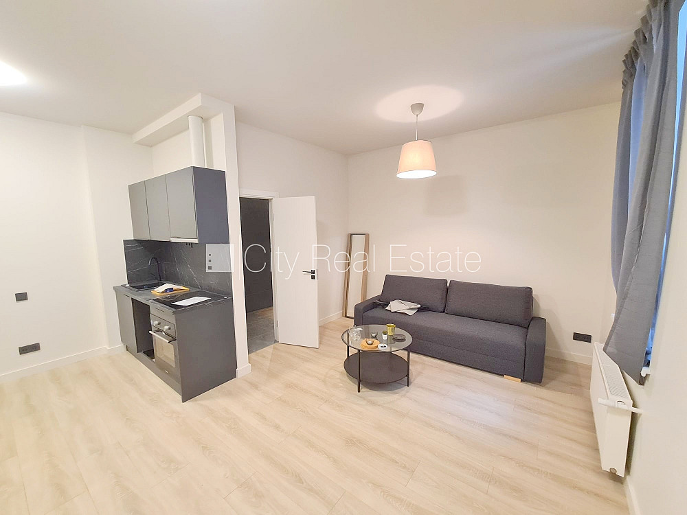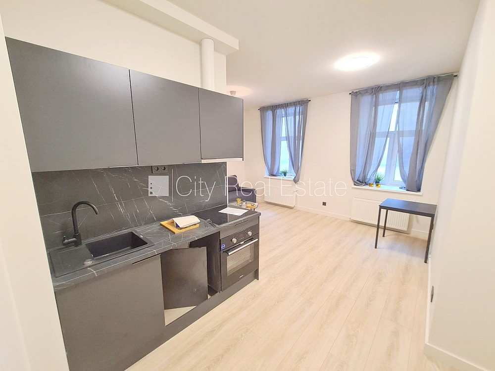 Fasādes māja, renovēta māja, slēgts pagalms, ieeja no ielas un pagalma, kāpņu telpa pēc kapitālā remonta, logi vērsti uz pagalma pusi, studio tipa, virtuve apvienota ar istabu, augstie griesti, centrālā apkure, pilnā apdare, plastikāta stikla pakešu logi, krāsotas sienas, jauna santehnika, lamināta parketa grīda, flīžu grīdas segums, sanitārais mezgls apvienots, dušas kabīne, tualete, iebūvēta virtuves iekārta, izvelkamais stūra dīvāns, virtuves galds, krēsli, skapis, ledusskapis, elektriskā plīts, cepeškrāsns, tvaika nosūcējs, veļas mašīna, slēgta kāpņu telpa, uz 1 gadu, ar iespēju pagarināt līgumu, atbrīvots, foto veikts remonta laikā, slēdzot īres līgumu, Jums būs jāmaksā par pirmo īres mēnesi , kā arī jāiemaksā drošības depozīts viena mēneša īres maksas apmērā, izvēloties šo īpašumu, komisijas maksa par starpniecības pakalpojumiem ir vienāda ar vienu pusi (50%) no šī īpašuma viena mēneša īres maksas, CITY REAL ESTATE ID - 515142