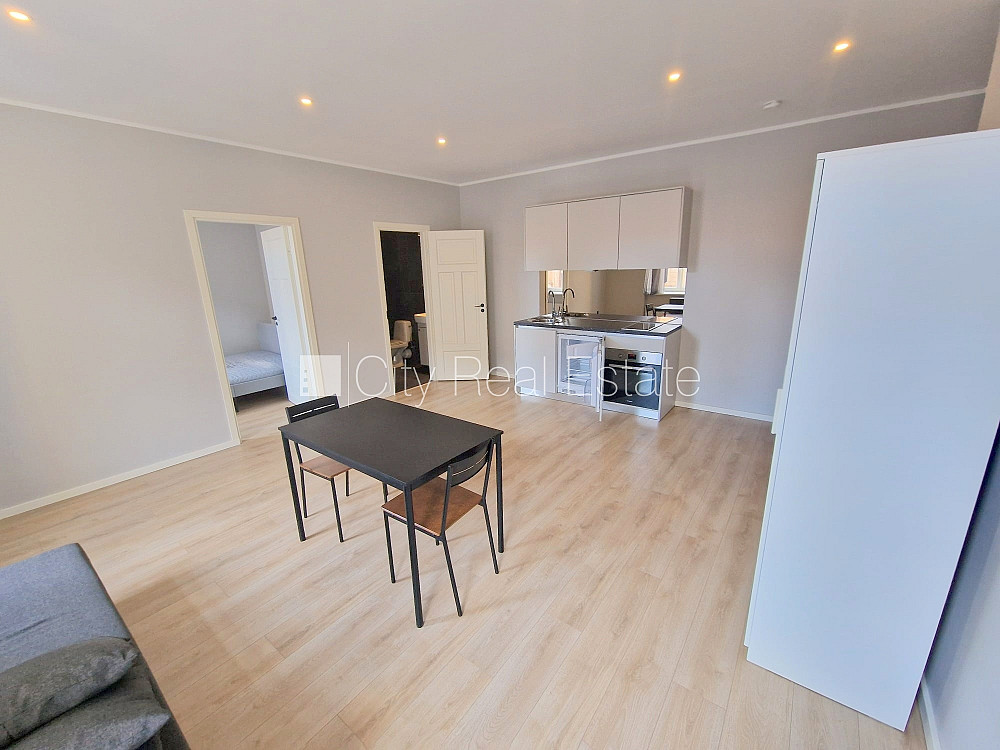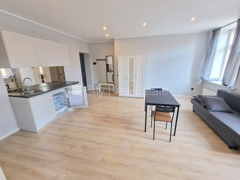 Fasādes māja, renovēta māja, slēgts pagalms, ieeja no ielas un pagalma, kāpņu telpa pēc kapitālā remonta, logi vērsti uz ielas pusi, guļamistabu skaits 1 gab., studio tipa, virtuve apvienota ar istabu, augstie griesti, centrālā apkure, pilnā apdare, plastikāta stikla pakešu logi, krāsotas sienas, jauna santehnika, lamināta parketa grīda, flīžu grīdas segums, sanitārais mezgls apvienots, dušas kabīne, tualete, iebūvēta virtuves iekārta, dīvāns, gulta , virtuves galds, krēsli, skapis, ledusskapis, elektriskā plīts, cepeškrāsns, tvaika nosūcējs, veļas mašīna, diennakts videonovērošana, uz 1 gadu, uz 2 gadiem, ar iespēju pagarināt līgumu, atbrīvots, slēdzot īres līgumu, Jums būs jāmaksā par pirmo īres mēnesi , kā arī jāiemaksā drošības depozīts viena mēneša īres maksas apmērā, izvēloties šo īpašumu, komisijas maksa par starpniecības pakalpojumiem ir vienāda ar vienu pusi (50%) no šī īpašuma viena mēneša īres maksas, CITY REAL ESTATE ID - 516614