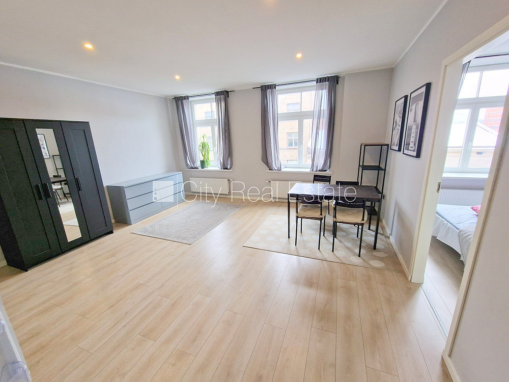 Fasādes māja, renovēta māja, slēgts pagalms, ieeja no ielas un pagalma, kāpņu telpa pēc kapitālā remonta, logi vērsti uz ielas pusi, plašs skats no loga, guļamistabu skaits 1 gab., studio tipa, virtuve apvienota ar istabu, augstie griesti, centrālā apkure, pilnā apdare, plastikāta stikla pakešu logi, krāsotas sienas, jauna santehnika, lamināta parketa grīda, sanitārais mezgls apvienots, dušas kabīne, tualete, iebūvēta virtuves iekārta, izvelkamais stūra dīvāns, gulta , virtuves galds, krēsli, skapis, ledusskapis, elektriskā plīts, cepeškrāsns, tvaika nosūcējs, veļas mašīna, slēgta kāpņu telpa, izīrē ar visu bildēs redzamo aprīkojumu, atbrīvots, slēdzot īres līgumu, Jums būs jāmaksā par pirmo īres mēnesi , kā arī jāiemaksā drošības depozīts, izvēloties šo īpašumu, komisijas maksa par starpniecības pakalpojumiem ir vienāda ar vienu pusi (50%) no šī īpašuma viena mēneša īres maksas, CITY REAL ESTATE ID - 517112