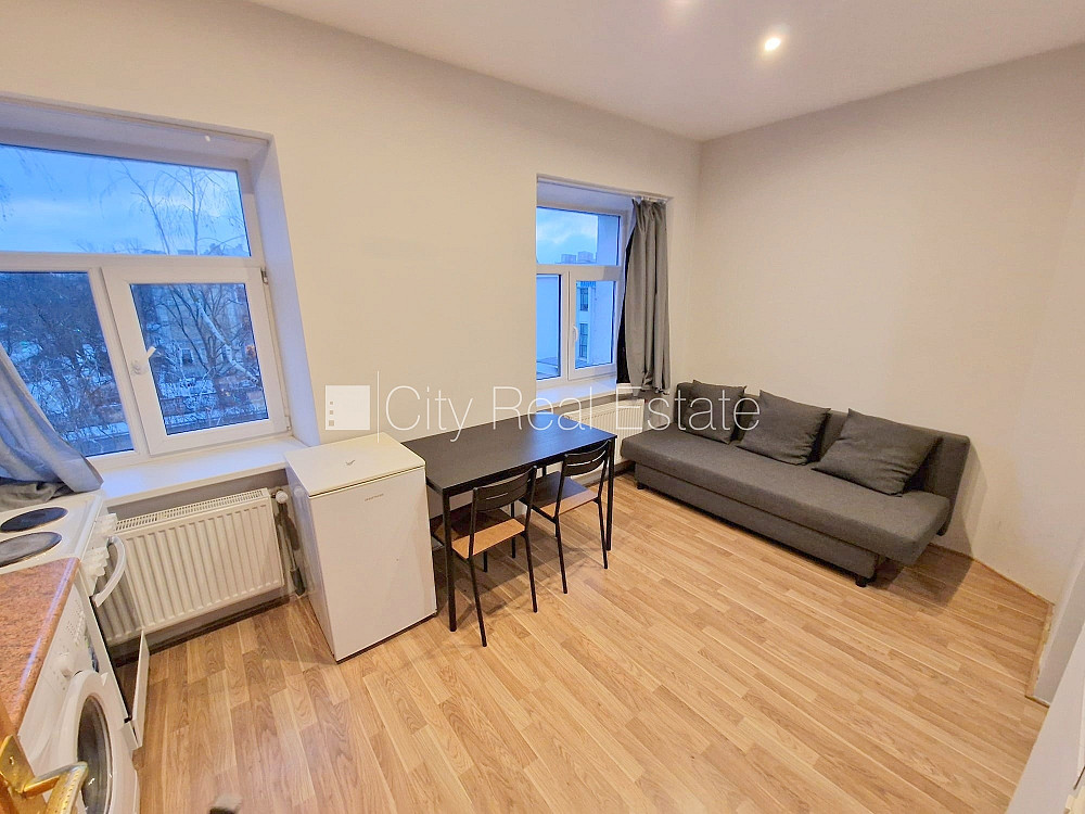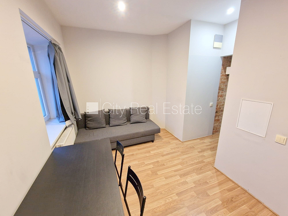 Fasādes māja, renovēta māja, slēgts pagalms, ieeja no ielas, kāpņu telpa pēc kosmētiskā remonta, logi vērsti uz pagalma pusi, studio tipa, virtuve apvienota ar istabu, augstie griesti, centrālā apkure, boilers karstajam ūdenim, pilnā apdare, plastikāta stikla pakešu logi, izlīmētas tapetes, krāsotas sienas, jauna santehnika, lamināta parketa grīda, flīžu grīdas segums, sanitārais mezgls apvienots, dušas kabīne, tualete, iebūvēta virtuves iekārta, izvelkamais stūra dīvāns, virtuves galds, krēsli, ledusskapis, elektriskā plīts, cepeškrāsns, tvaika nosūcējs, veļas mašīna, slēgta kāpņu telpa, izīrē ar visu bildēs redzamo aprīkojumu, atbrīvots, projektā vēl pieejami dzīvokļi 2 gab., slēdzot īres līgumu, Jums būs jāmaksā par pirmo īres mēnesi , kā arī jāiemaksā drošības depozīts, izvēloties šo īpašumu, komisijas maksa par starpniecības pakalpojumiem ir vienāda ar vienu pusi (50%) no šī īpašuma viena mēneša īres maksas, CITY REAL ESTATE ID - 427275