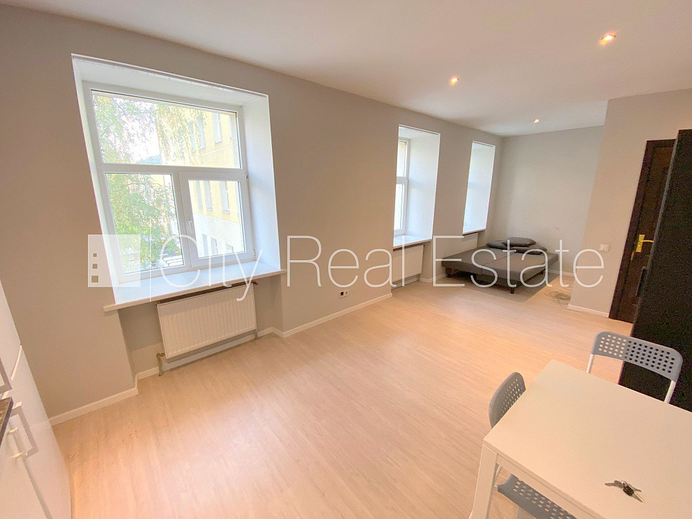 Fasādes māja, renovēta māja, slēgts pagalms, ieeja no pagalma, kāpņu telpa pēc kosmētiskā remonta, logi vērsti uz pagalma pusi, studio tipa, virtuve apvienota ar istabu, augstie griesti, centrālā apkure, pilnā apdare, plastikāta stikla pakešu logi, krāsotas sienas, jauna santehnika, lamināta parketa grīda, flīžu grīdas segums, sanitārais mezgls apvienots, dušas kabīne, tualete, iebūvēta virtuves iekārta, ledusskapis, elektriskā plīts, cepeškrāsns, tvaika nosūcējs, veļas mašīna, slēgta kāpņu telpa, atbrīvots, slēdzot īres līgumu, Jums būs jāmaksā par pirmo īres mēnesi , kā arī jāiemaksā drošības depozīts viena mēneša īres maksas apmērā, izvēloties šo īpašumu, komisijas maksa par starpniecības pakalpojumiem ir vienāda ar vienu pusi (50%) no šī īpašuma viena mēneša īres maksas, CITY REAL ESTATE ID - 435645