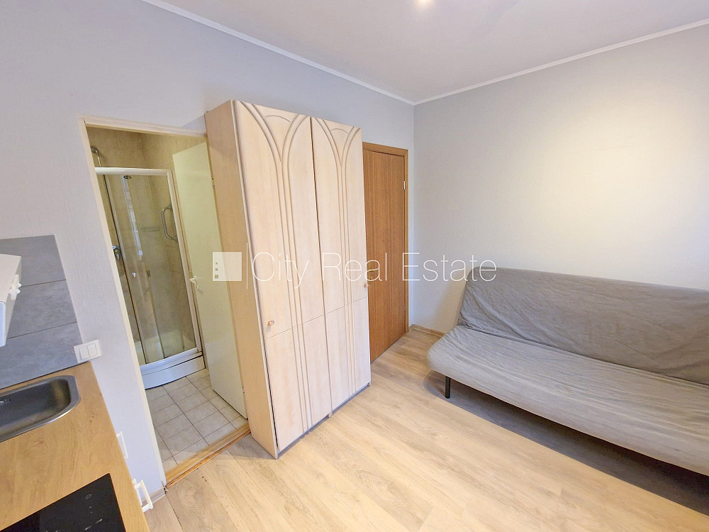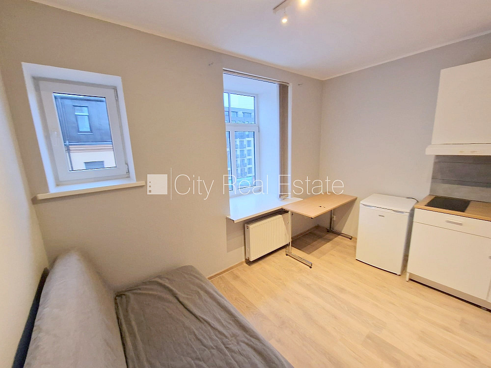 Fasādes māja, renovēta māja, slēgts pagalms, ieeja no pagalma, kāpņu telpa pēc kapitālā remonta, logi vērsti uz pagalma pusi, studio tipa, virtuve apvienota ar istabu, augstie griesti, centrālā apkure, pilnā apdare, plastikāta stikla pakešu logi, krāsotas sienas, lamināta parketa grīda, flīžu grīdas segums, sanitārais mezgls apvienots, dušas kabīne, tualete, iebūvēta virtuves iekārta, dīvāns, virtuves galds, krēsli, skapis, ledusskapis, elektriskā plīts, tvaika nosūcējs, veļas mašīna, slēgta kāpņu telpa, izīrē ar visu bildēs redzamo aprīkojumu, atbrīvots, slēdzot īres līgumu, Jums būs jāmaksā par pirmo īres mēnesi , kā arī jāiemaksā drošības depozīts viena mēneša īres maksas apmērā, izvēloties šo īpašumu, komisijas maksa par starpniecības pakalpojumiem ir vienāda ar vienu pusi (50%) no šī īpašuma viena mēneša īres maksas, CITY REAL ESTATE ID - 507156