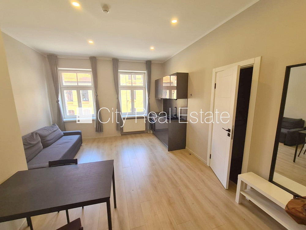 Fasādes māja, renovēta māja, slēgts pagalms, ieeja no pagalma, ir lifts, kāpņu telpa pēc kapitālā remonta, logi vērsti uz ielas pusi, studio tipa, virtuve apvienota ar istabu, augstie griesti, centrālā apkure, pilnā apdare, plastikāta stikla pakešu logi, krāsotas sienas, jauna santehnika, lamināta parketa grīda, flīžu grīdas segums, sanitārais mezgls apvienots, dušas kabīne, tualete, iebūvēta virtuves iekārta, dīvāns, virtuves galds, krēsli, skapis, ledusskapis, elektriskā plīts, cepeškrāsns, tvaika nosūcējs, veļas mašīna, dūmu detektors, slēgta kāpņu telpa, izīrē ar visu bildēs redzamo aprīkojumu, atbrīvo maijā, slēdzot īres līgumu, Jums būs jāmaksā par pirmo īres mēnesi , kā arī jāiemaksā drošības depozīts viena mēneša īres maksas apmērā, izvēloties šo īpašumu, komisijas maksa par starpniecības pakalpojumiem ir vienāda ar vienu pusi (50%) no šī īpašuma viena mēneša īres maksas, CITY REAL ESTATE ID - 511394