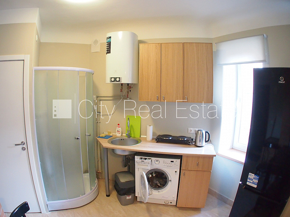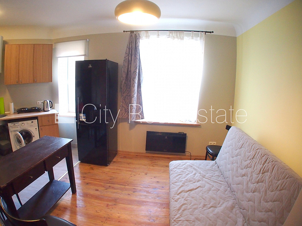 Fasādes māja, ieeja no ielas, logi vērsti uz pagalma pusi, studio tipa, virtuve apvienota ar istabu, augstie griesti, saglabāta krāsns, malkas apkure, elektriskā apkure, boilers karstajam ūdenim, pilnā apdare, plastikāta stikla pakešu logi, metāla durvis, izlīmētas tapetes, jauna santehnika, lamināta parketa grīda, flīžu grīdas segums, dušas kabīne, tualete, iebūvēta virtuves iekārta, dīvāns, galds, skapis, ledusskapis, elektriskā plīts, veļas mašīna, izīrē ar visu bildēs redzamo aprīkojumu, uz 1 gadu, ar iespēju pagarināt līgumu, līdz divām personām, atbrīvots, slēdzot īres līgumu, Jums būs jāmaksā par pirmo īres mēnesi , kā arī jāiemaksā drošības depozīts viena mēneša īres maksas apmērā, izvēloties šo īpašumu, komisijas maksa par starpniecības pakalpojumiem ir vienāda ar vienu pusi (50%) no šī īpašuma viena mēneša īres maksas, CITY REAL ESTATE ID - 426557