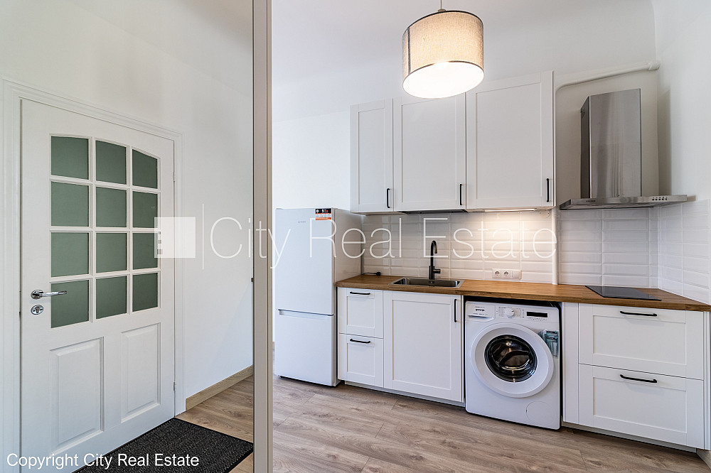 Fasādes māja, slēgts pagalms, ieeja no pagalma, logi vērsti uz ielas pusi, studio tipa, virtuve apvienota ar istabu, augstie griesti, centrālā apkure, koka stikla pakešu logi, krāsotas sienas, jauna santehnika, koka dēļu grīdas segums, sanitārais mezgls apvienots, dušas kabīne, iebūvēta virtuves iekārta, drēbju skapis, ledusskapis, indukcijas plīts, tvaika nosūcējs, veļas mašīna, slēgta kāpņu telpa, slēdzot īres līgumu, Jums būs jāmaksā par pirmo īres mēnesi , kā arī jāiemaksā drošības depozīts viena mēneša īres maksas apmērā, izvēloties šo īpašumu, komisijas maksa par starpniecības pakalpojumiem ir vienāda ar vienu pusi (50%) no šī īpašuma viena mēneša īres maksas, CITY REAL ESTATE ID - 430269