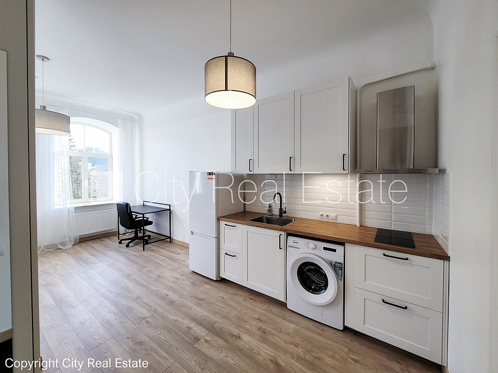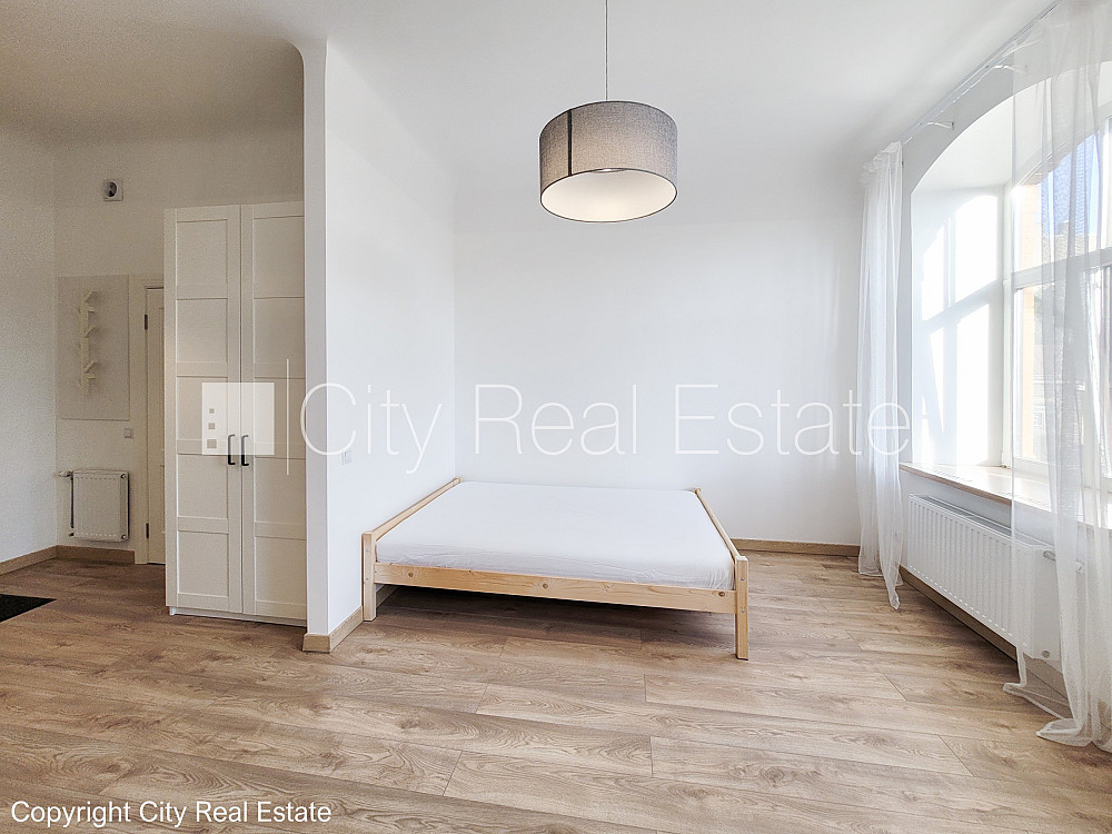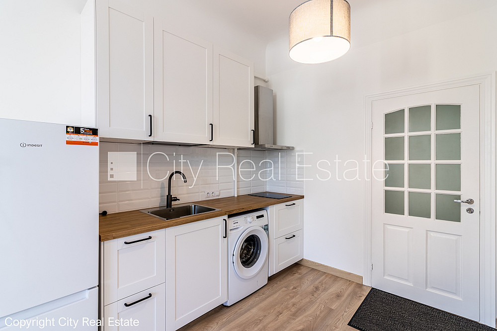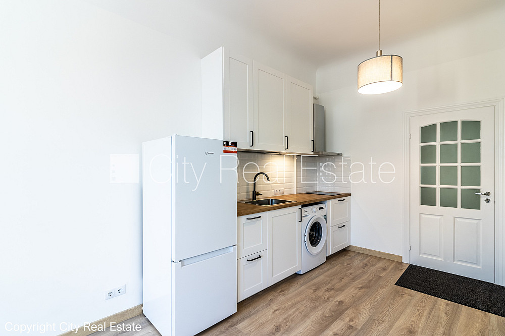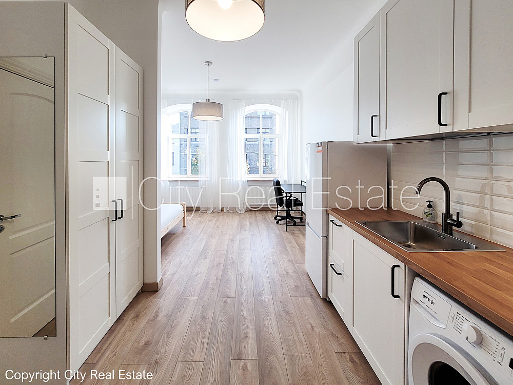 Fasādes māja, slēgts pagalms, ieeja no pagalma, logi vērsti uz ielas pusi, studio tipa, virtuve apvienota ar istabu, augstie griesti, centrālā apkure, koka stikla pakešu logi, krāsotas sienas, jauna santehnika, koka dēļu grīdas segums, sanitārais mezgls apvienots, dušas kabīne, iebūvēta virtuves iekārta, drēbju skapis, ledusskapis, indukcijas plīts, tvaika nosūcējs, veļas mašīna, slēgta kāpņu telpa, slēdzot īres līgumu, Jums būs jāmaksā par pirmo īres mēnesi , kā arī jāiemaksā drošības depozīts viena mēneša īres maksas apmērā, izvēloties šo īpašumu, komisijas maksa par starpniecības pakalpojumiem ir vienāda ar vienu pusi (50%) no šī īpašuma viena mēneša īres maksas, CITY REAL ESTATE ID - 430269