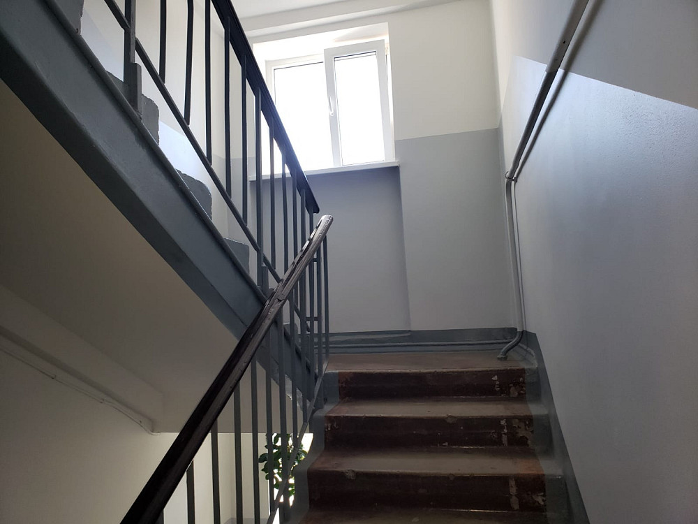 Nesen renovēta kāpņu telpa; kāpņu telpām metāla durvis, slēdzamas ar koda atslēgu.