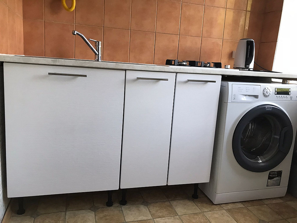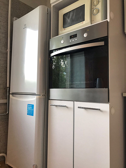 Нагрев воды с помощью современного газового водонагревателя Junkers происходит автоматически при подаче воды .Стиральная машина, холодильник, газовая плита, встроенная электрическая духовка, микроволновка. Мебель на кухне новая.