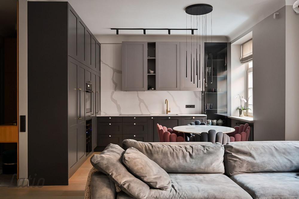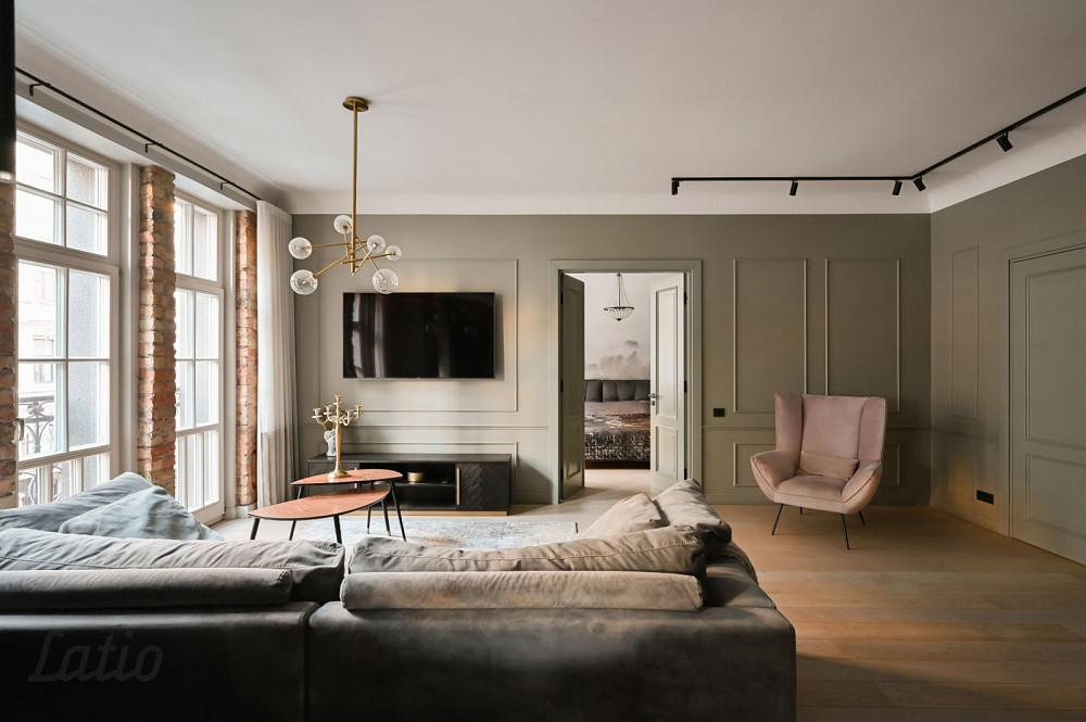 Dzīvoklī ir plaša un reprezentabla viesistaba ar lieliem logiem, kas nodrošina izcilu dabisko apgaismojumu un patīkamu atmosfēru ikdienā. Augstie griesti, dabīgais parkets un gaumīgi interjera risinājumi rada izsmalcinātu un mājīgu sajūtu.