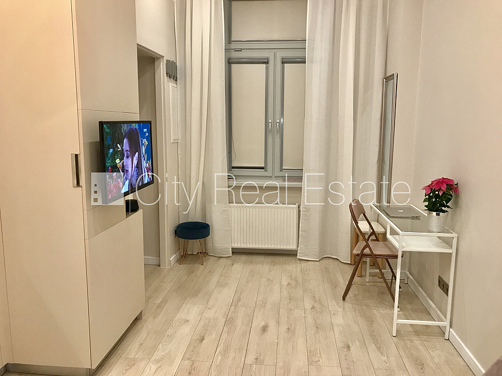 Renovēta māja, slēgts pagalms, ir lifts, kāpņu telpa pēc kapitālā remonta, studio tipa, virtuve apvienota ar istabu, krāsotas sienas, jauna santehnika, parketa grīda, sanitārais mezgls apvienots, vanna, iebūvēta virtuves iekārta, iebūvēti sienas skapji, dīvāns, gulta , televizors, ledusskapis, elektriskā plīts, tvaika nosūcējs, veļas mašīna, internets, diennakts videonovērošana, kāpņu telpā koda atslēga, CITY REAL ESTATE ID - 427213