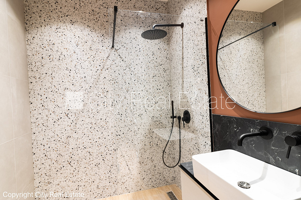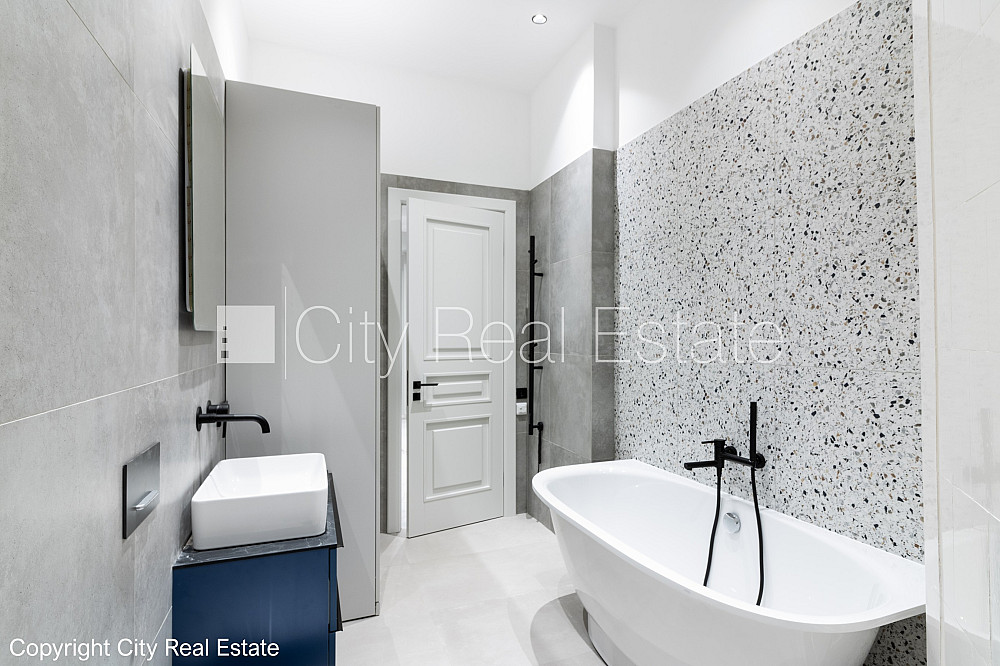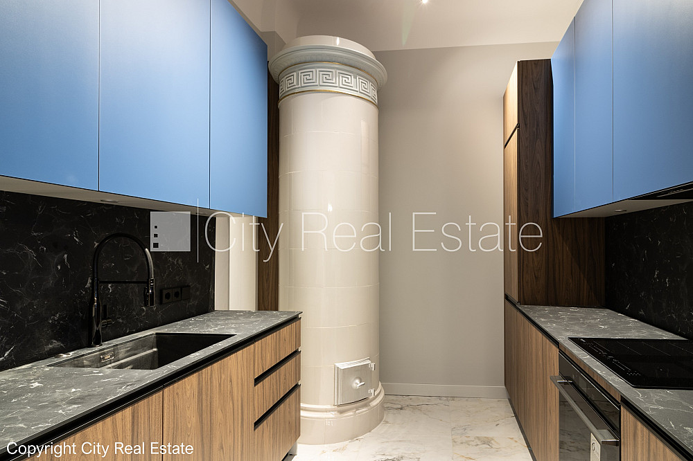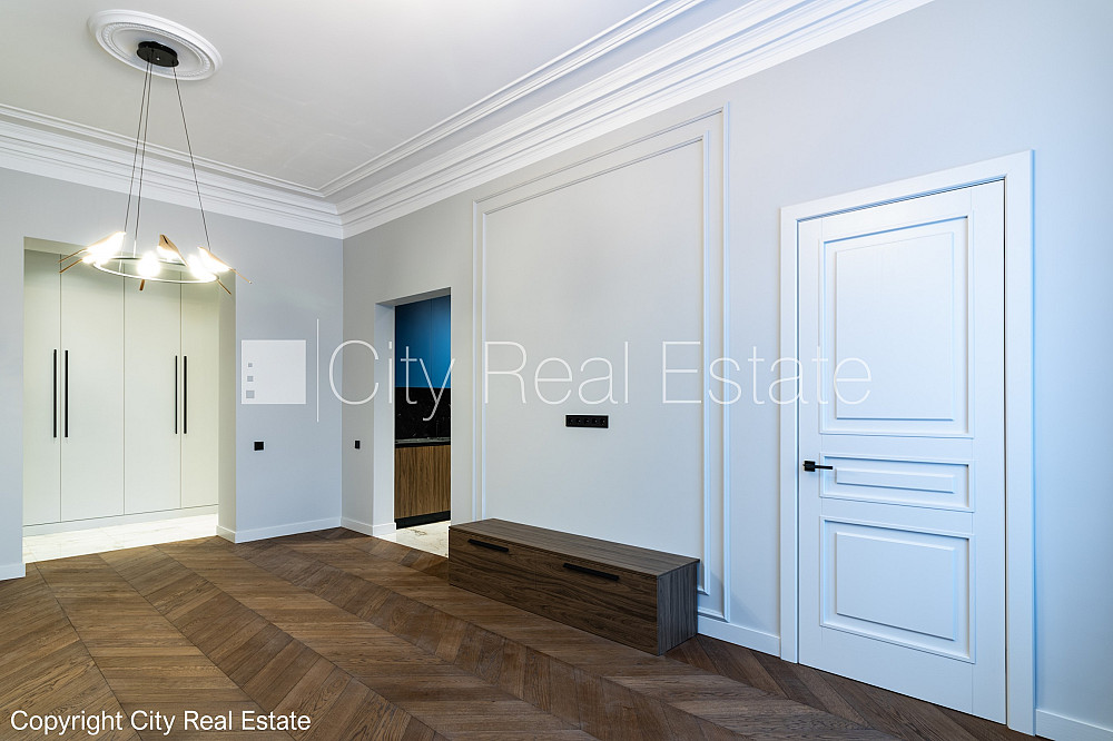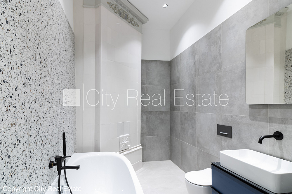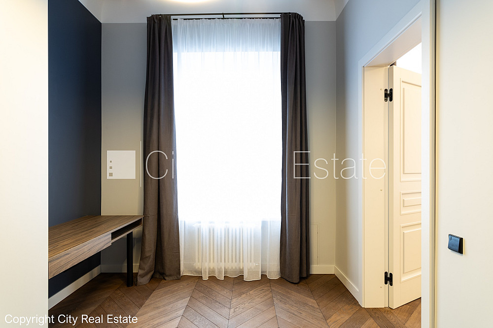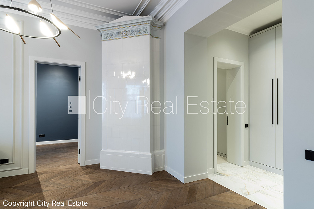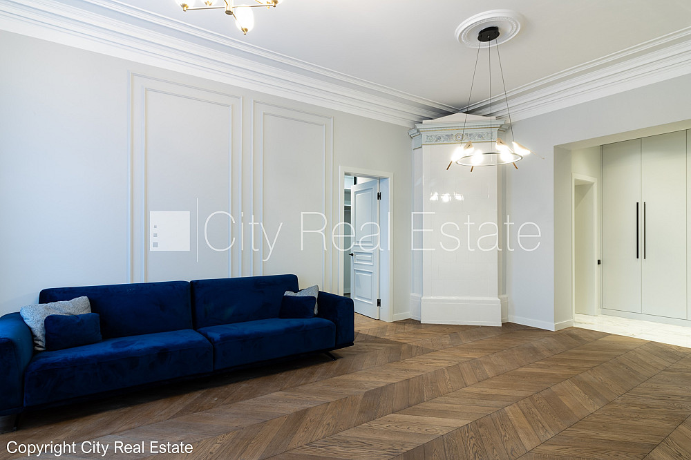 Slēgts pagalms, ieeja no ielas un pagalma, kāpņu telpa pēc kosmētiskā remonta, logi vērsti uz ielas pusi, plašs skats no loga, guļamistabu skaits 3 gab., viesistaba, virtuve, garderobe 2 m2, kabinets, augstie griesti, dekoratīvais kamīns, centrālā apkure, apkures skaitītāji, individuāla apkures sistēmas uzskaite, pilnā apdare, apsildāma grīda vannas istabā, dubultās metāla durvis , jauna santehnika, ozola koka grīdas segums, jauna elektroinstalācija, vairāki sanitārie mezgli, vanna, dušas kabīne, tualete, iebūvēta virtuves iekārta, iebūvēti sienas skapji, dīvāns, spogulis, ledusskapis, trauku mazgājamā mašīna, elektriskā plīts, cepeškrāsns, veļas mašīna, dūmu detektors, slēgta kāpņu telpa, izīrē ar visu bildēs redzamo aprīkojumu, sienas lampas, glezna, spilveni, uz 1 gadu, ar iespēju pagarināt līgumu, atbrīvots, CITY REAL ESTATE ID - 515838
