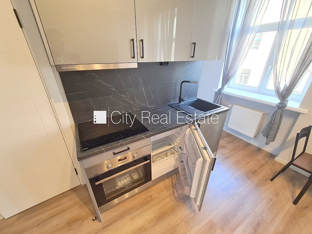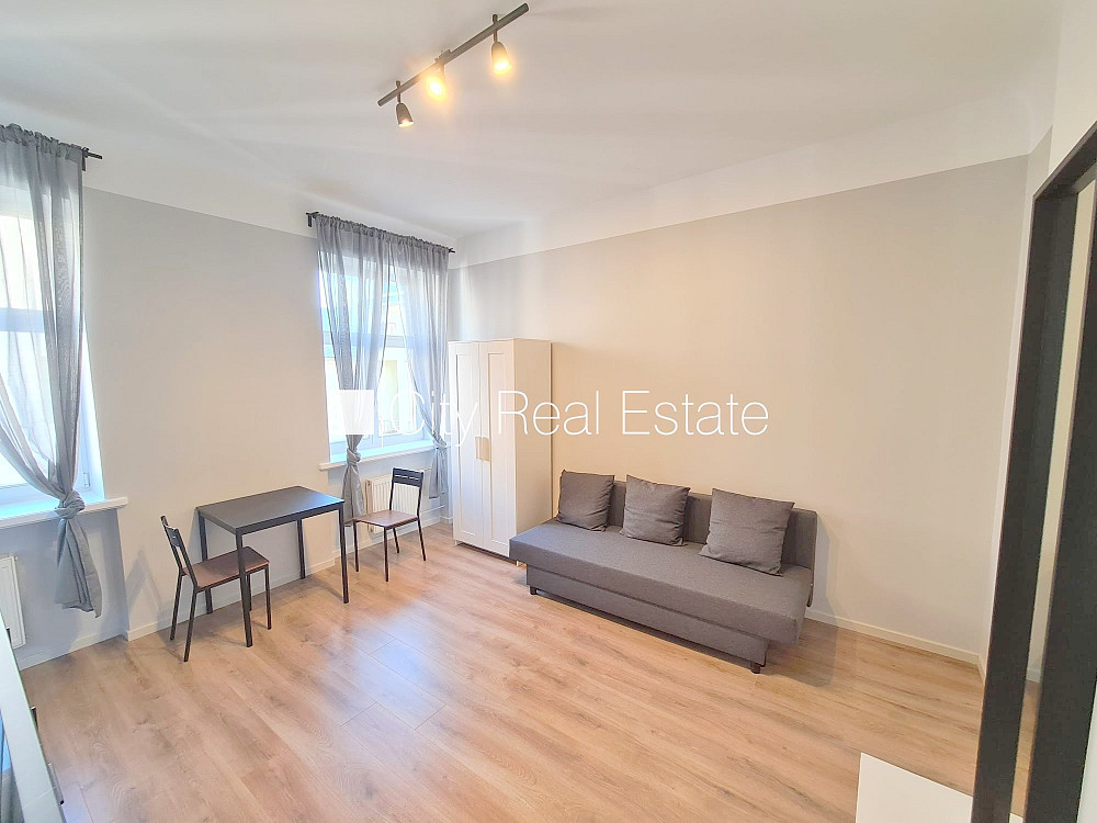 Pagalma ēka, fasādes māja, slēgts pagalms, ieeja no ielas un pagalma, ir lifts, kāpņu telpa pēc kapitālā remonta, logi vērsti uz pagalma pusi, studio tipa, virtuve apvienota ar istabu, augstie griesti, centrālā apkure, pilnā apdare, koka stikla pakešu logi, krāsotas sienas, jauna santehnika, lamināta parketa grīda, flīžu grīdas segums, sanitārais mezgls apvienots, dušas kabīne, tualete, iebūvēta virtuves iekārta, izvelkamais stūra dīvāns, virtuves galds, krēsli, skapis, ledusskapis, elektriskā plīts, cepeškrāsns, tvaika nosūcējs, veļas mašīna, slēgta kāpņu telpa, izīrē ar visu bildēs redzamo aprīkojumu, atbrīvo augustā, slēdzot īres līgumu, Jums būs jāmaksā par pirmo īres mēnesi , kā arī jāiemaksā drošības depozīts viena mēneša īres maksas apmērā, izvēloties šo īpašumu, komisijas maksa par starpniecības pakalpojumiem ir vienāda ar vienu pusi (50%) no šī īpašuma viena mēneša īres maksas, CITY REAL ESTATE ID - 512409