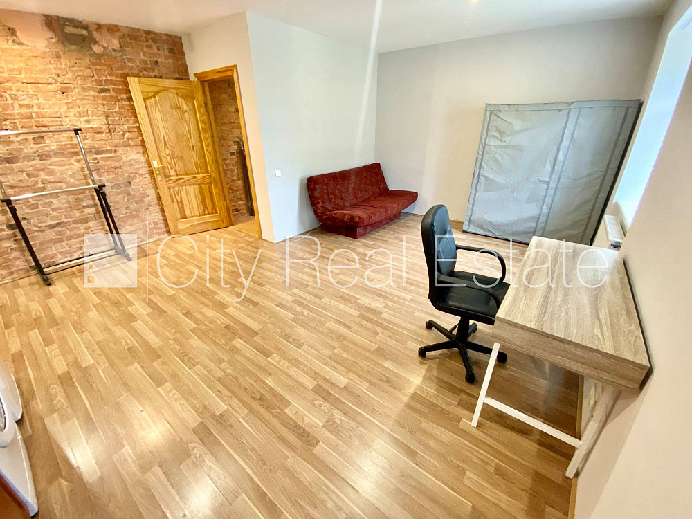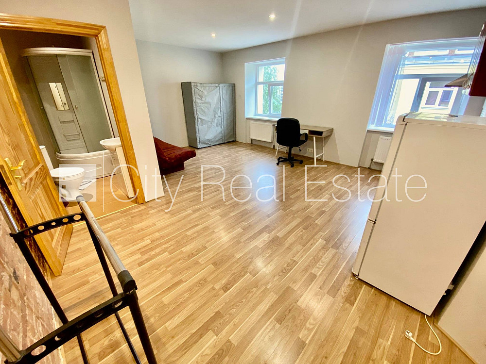 Pagalma ēka, renovēta māja, ieeja no ielas, kāpņu telpa pēc kosmētiskā remonta, logi vērsti uz pagalma pusi, studio tipa, virtuve apvienota ar istabu, augstie griesti, centrālā apkure, pilnā apdare, plastikāta stikla pakešu logi, krāsotas sienas, jauna santehnika, lamināta parketa grīda, flīžu grīdas segums, sanitārais mezgls apvienots, dušas kabīne, tualete, iebūvēta virtuves iekārta, dīvāns, datorgalds, ledusskapis, elektriskā plīts, cepeškrāsns, tvaika nosūcējs, veļas mašīna, slēgta kāpņu telpa, izīrē ar visu bildēs redzamo aprīkojumu, atbrīvots, slēdzot īres līgumu, Jums būs jāmaksā par pirmo īres mēnesi , kā arī jāiemaksā drošības depozīts viena mēneša īres maksas apmērā, izvēloties šo īpašumu, komisijas maksa par starpniecības pakalpojumiem ir vienāda ar vienu pusi (50%) no šī īpašuma viena mēneša īres maksas, CITY REAL ESTATE ID - 506784