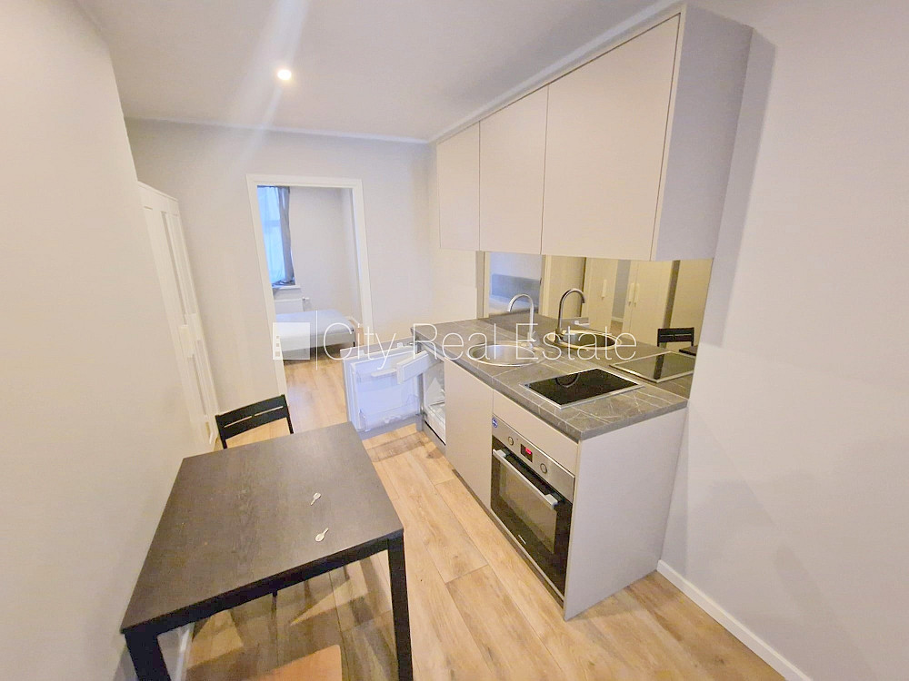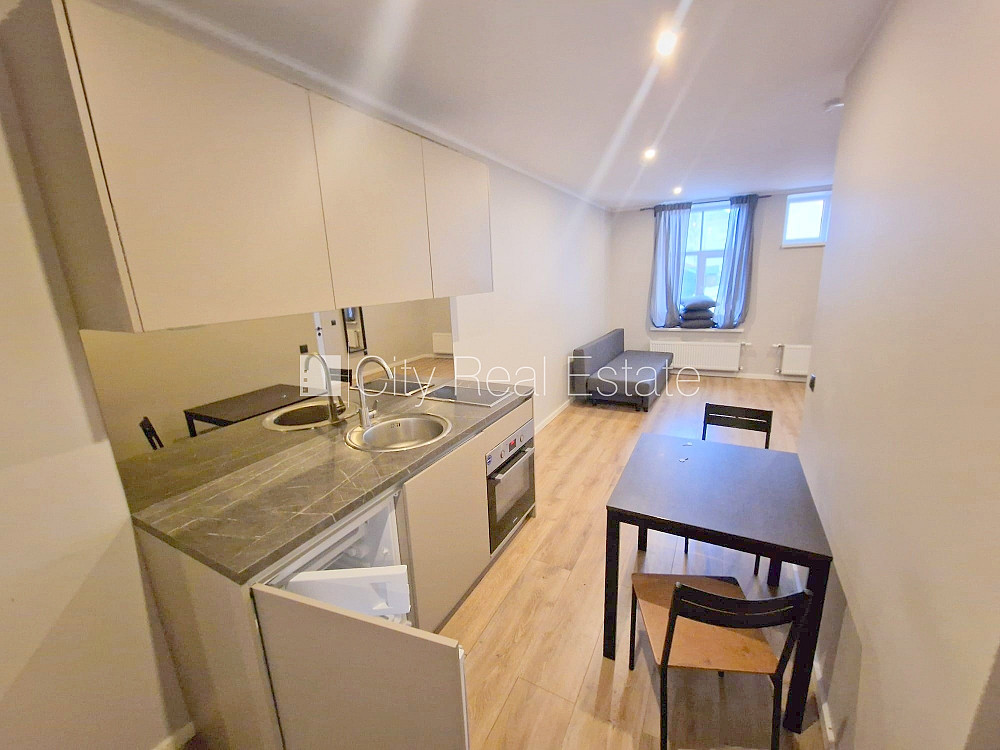 Pagalma ēka, renovēta māja, slēgts pagalms, ieeja no ielas un pagalma, kāpņu telpa pēc kapitālā remonta, logi vērsti uz pagalma pusi, guļamistabu skaits 1 gab., studio tipa, virtuve apvienota ar istabu, augstie griesti, centrālā apkure, pilnā apdare, plastikāta stikla pakešu logi, krāsotas sienas, jauna santehnika, lamināta parketa grīda, flīžu grīdas segums, sanitārais mezgls apvienots, dušas kabīne, tualete, iebūvēta virtuves iekārta, izvelkamais stūra dīvāns, gulta , virtuves galds, krēsli, skapis, ledusskapis, elektriskā plīts, cepeškrāsns, tvaika nosūcējs, veļas mašīna, slēgta kāpņu telpa, izīrē ar visu bildēs redzamo aprīkojumu, atbrīvots, slēdzot īres līgumu, Jums būs jāmaksā par pirmo īres mēnesi , kā arī jāiemaksā drošības depozīts, izvēloties šo īpašumu, komisijas maksa par starpniecības pakalpojumiem ir vienāda ar vienu pusi (50%) no šī īpašuma viena mēneša īres maksas, CITY REAL ESTATE ID - 517080
