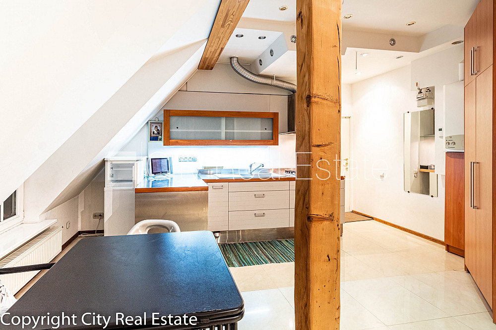 Fasādes māja, mansards, divstāvīgs, studio tipa, virtuve apvienota ar istabu, gāzes apkure, plastikāta stikla pakešu logi, jumta logi, lamināta parketa grīda, flīžu grīdas segums, sanitārais mezgls apvienots, divi sanitārie mezgli, vanna, dušas kabīne, iebūvēta virtuves iekārta, iebūvēti sienas skapji, dīvāns, divguļamā gulta, virtuves galds, žurnālu galdiņš, bāra lete, bāra krēsli, virtuves krēsli, skapis, spogulis, viena telpa izolēta, kāpņu telpā koda atslēga, stratēģiski izdevīga vieta, CITY REAL ESTATE ID - 516264