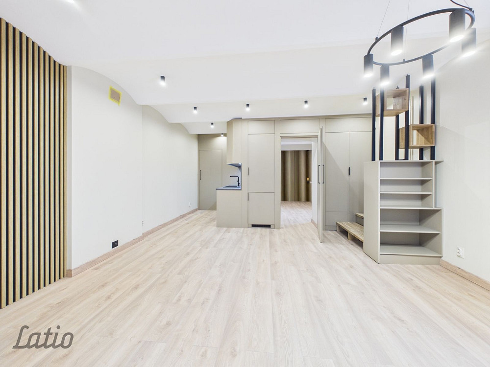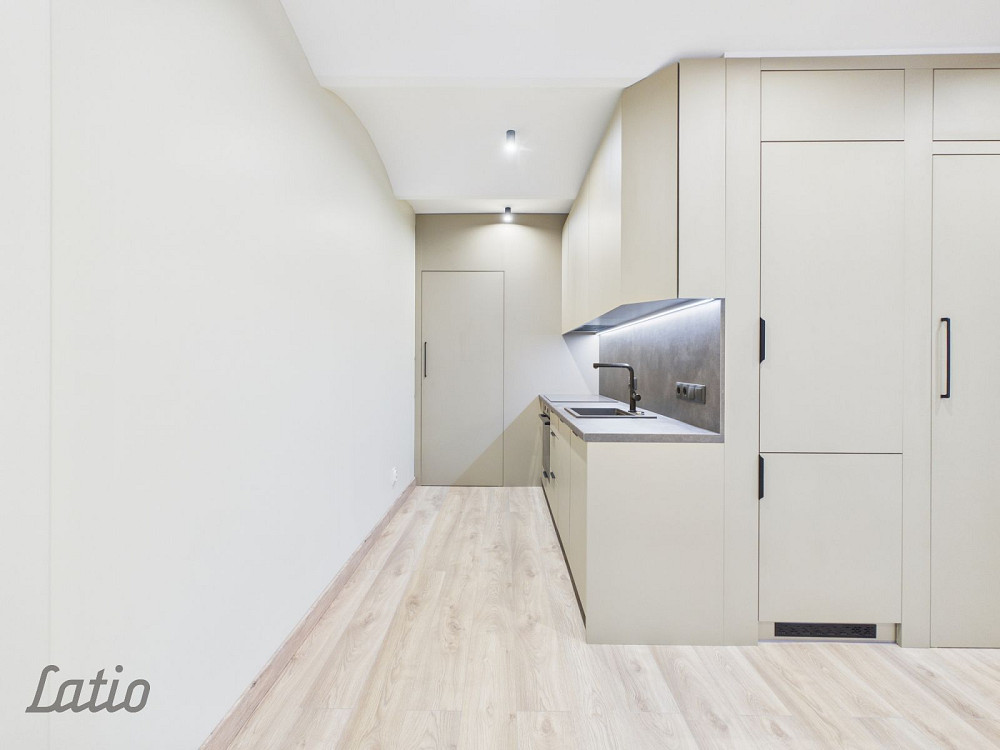 Pārdomāta telpa: Plaša studijas tipa viesistaba, kas apvienota ar virtuvi, un viena pilnībā izolēta, klusa guļamistaba.