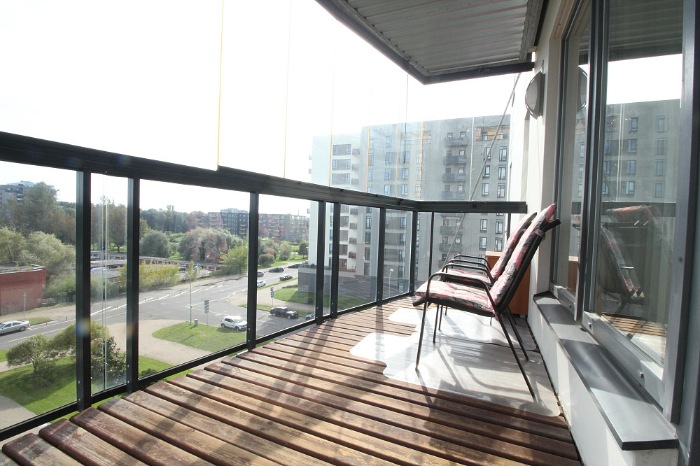 Move-in ready: living room with kitchen, bedroom, bathroom with heated floor, glazed terrace overlooking the quiet courtyard. Built-in kitchen with quality appliances, furniture included. Energy-efficient building with very low utilities. Gated area with security and concierge, underground parking with remote access. Clean yard and playground for residents only. Prestigious and safe Skanste district, shops, schools nearby, few minutes to city centre . Apartment is vacant.