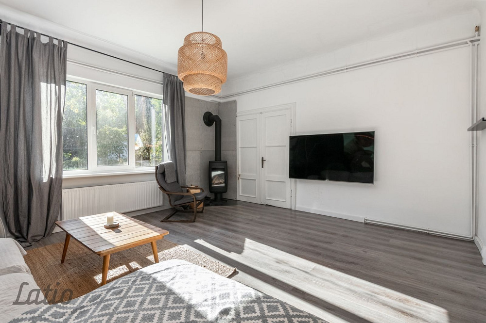 Pārdošanā 1/2 domājamā daļa no privātmājas, kas sastāv no lietošanā esošo telpu kopējā platības 171.7 kv. m. , t. sk. 116.8 kv. m. pirmā stāva iekštelpas, 19.5 kv. m. ārtelpas un 35.4 kv. m. pagrabstāva telpas. Koplietošanā esošā zemes gabala platība 1200 kv. m.