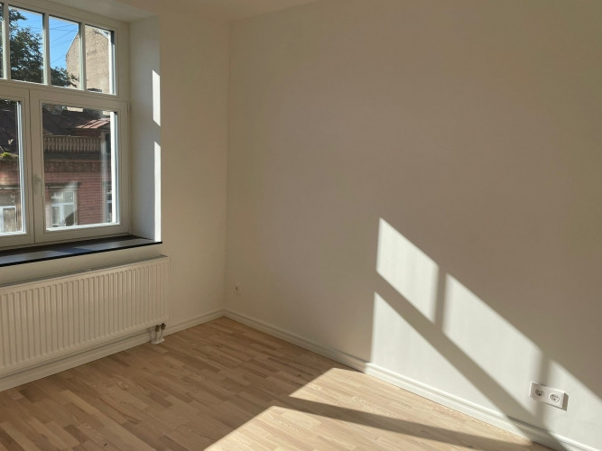 Tiek pārdots gaišs un saulains renovēts 2-istabu dzīvoklis un atsevišķu virtuvi. Katram dzīvoklim šajā projektā ir individuālie siltuma skaitītāji. Dzīvoklis pārdodas ar kvalitatīvu apdari (trīsslāņu pakešu logi, parketa grīdas), ar visu nepieciešamo santehniku, ar veļas mašīnu, ar gaismekļiem, ir virtuve ar iebūvētu sadzīves tehniku. Zeme īpašumā. Ēka pilnībā renovēta, nomainīti stāvvadi un komunikācijas; atjaunota kāpņu telpa, fasāde un pagalms ar videonovērošanu. Tuvumā veikali, kafejnīcas, bāri, sabiedriskais transports. Ir arī citi dzīvokļi šajā projektā.