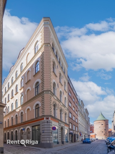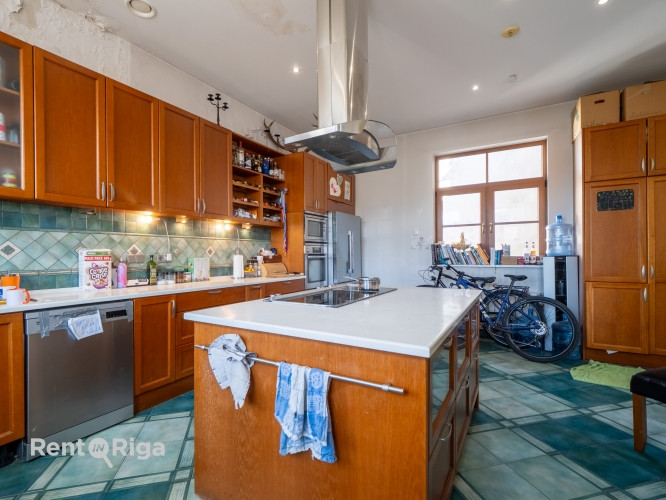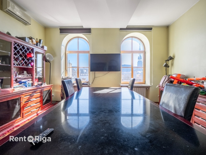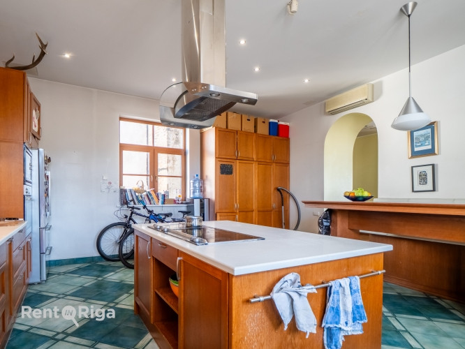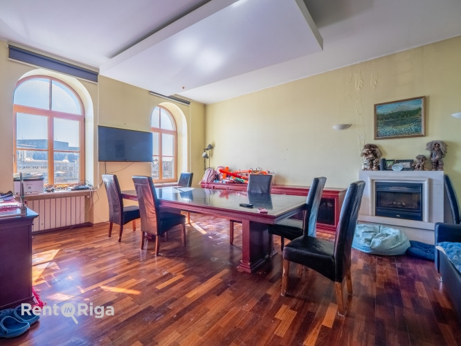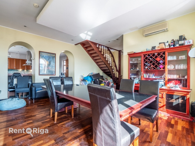 Kluss un saulains 2-stāvu dzīvoklis ar terasi, saunu un 2 kamīniem. Pirmajā līmenī ir izvietota ēdamistaba, liela virtuve (34 kvm), 2 guļamistabas (9 + 14 kvm), liela tualete ar saunu un dušu, ieejas garderobe. Otrajā līmenī ir liela viesistaba (46 kvm), istaba ar džakuzi baseinu un virtuvīti (stikla griesti), terase ar panorāmas skatu, guļamistaba, tualete ar lielu dušu un vannu, garderobe, saimniecības telpa un viesu tualete. Dzīvoklim ir individuālais apkures katls. 6 kondicionieri. Īpašums tiek pārdots ar visu iebūvēto virtuvi, lielajām mēbelēm un iebūvētajiem skapjiem. Augsti griesti - 1.līmenī 3.16 m, 2.līmenī 2.65 m, kore 3.95 m. Ozolkoka trepes, sarkankoka parkets. Ēkai šobrīd nav lifts, bet ir lēzenas kāpnes. Šī gada rudenī ēkā tiks uzsākta lifta izbūve. Remontēta trepju telpa.