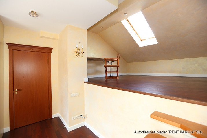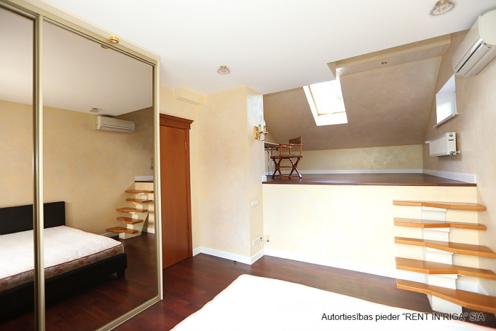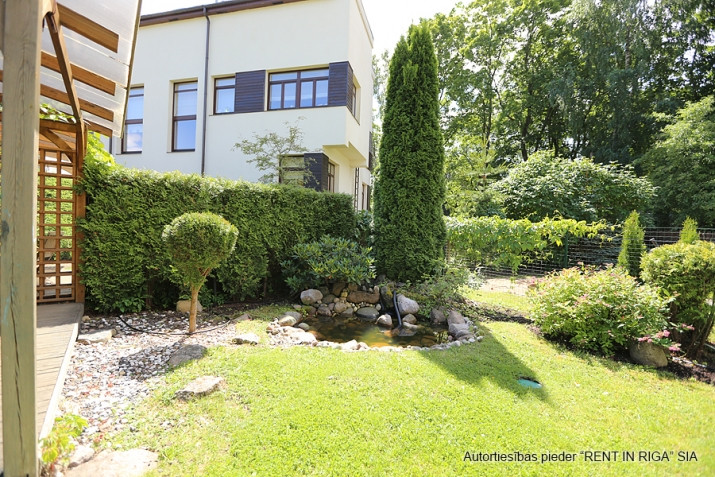 Tiek izīrēta sekciju rindu mājā Rīgas visprestižākajā rajonā Mežaparkā. Māja atrodas zaļā, klusā, drošā vietā, ar lielisku infrastruktūru, 15 minūšu attālumā līdz Vecrīgai. Mājai šogad veikta fasādes un jumta kapitāla renovācija. Siltās grīdas, autonomā gāzes apkure, kondicionieris, 2 stāvvietas, dārzs, dīķītis, plaša lapene dārzā, plaša vannas istaba ar džakuzi, 2 vannas istabas, 3 guļamistabas, viesistaba, virtuve, bēniņi ar apdari mantu glabātuvei. Papildus maksājumi: komunālie maksājumi pēc individuāliem skaitītājiem un sētniekam 30 EUR mēnesī.