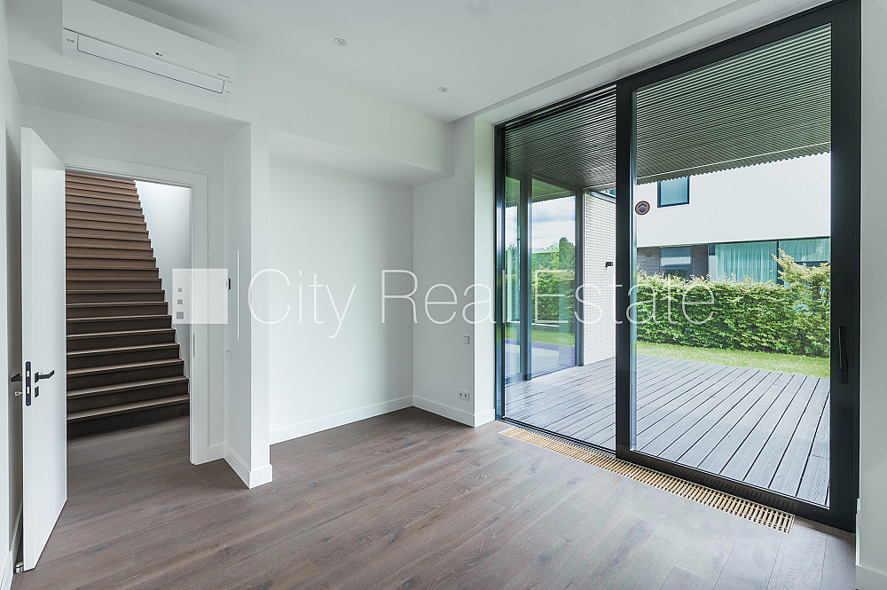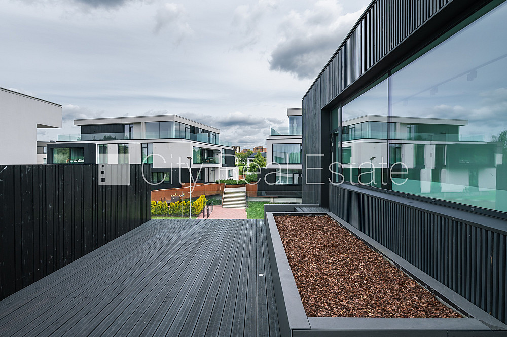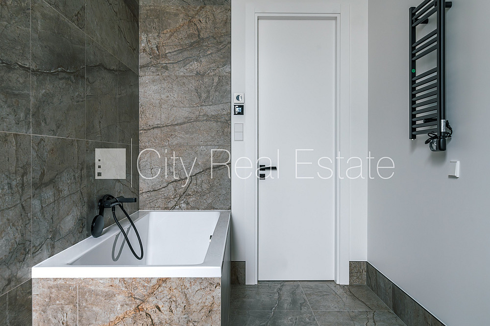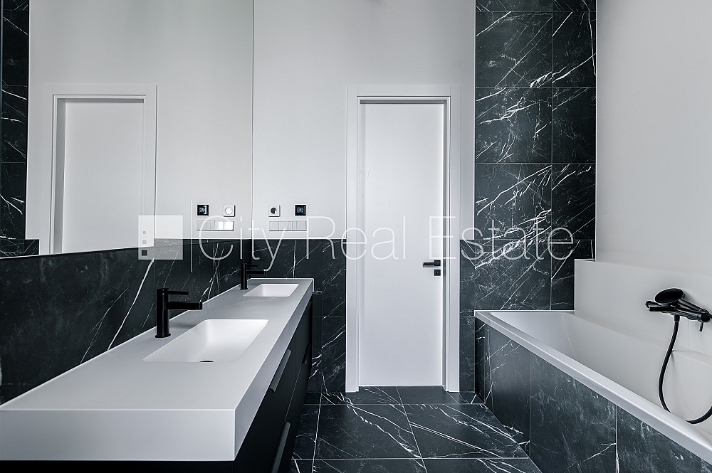 Dvīņu māja, labiekārtota apzaļumota teritorija, bruģēts piebraucamais ceļš, iežogota teritorija, garāža divām automašīnām, apzaļumota teritorija ar jaunu kokaugu stādījumiem, divas terases, plašs skats no loga, istabas izolētas 3 gab., studio tipa, virtuve apvienota ar viesistabu, garderobe, halle, kabinets, palīgtelpa, veļas mazgātava, divas ieejas, gāzes apkure, apkures skaitītāji, individuāla apkures sistēmas uzskaite, divos līmeņos, pilnā apdare, apsildāma grīda vannas istabā, lielie skatlogi, alumīnija stikla pakešu logi, koka dēļu grīdas segums, flīžu grīdas segums, trīs sanitārie mezgli, vanna, dušas kabīne, iebūvēta virtuves iekārta, iebūvēti sienas skapji, gaisa kondicionieris, ledusskapis, trauku mazgājamā mašīna, elektriskā plīts, cepeškrāsns, tvaika nosūcējs, mikroviļņu krāsns, optiskais internets, signalizācija, diennakts videonovērošana, atbrīvots, līdz centram 7 km, līdz parkam 1,8 km, stratēģiski izdevīga vieta, CITY REAL ESTATE ID - 516654