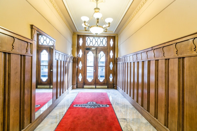 Fasādes ēka, 2. stāvs, ieeja no fasādes ēkas (melnā izeja uz iekšpagalmu), reprezentabla kāpņu telpa, solīdi kaimiņi, logi vērsti gan uz Kr.Valdemāra ielas pusi, gan ēkas iekšpagalmu.