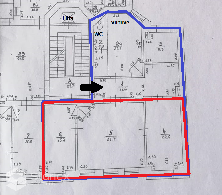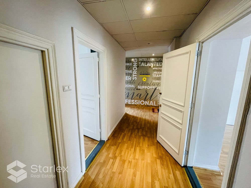 Plānojums: 3 darba telpas (2 izolētas), ar 2 nelieliem kaimiņu birojiem kopīgas labierīcības.Ērtības: pilsētas apkure, sanitārais mezgls, ugunsdrošības signalizācija, visas komunikācijas, lifts, dzīvā apsardze.