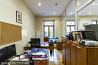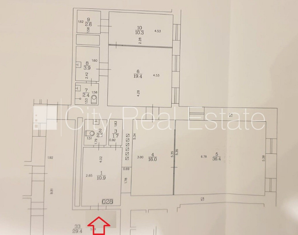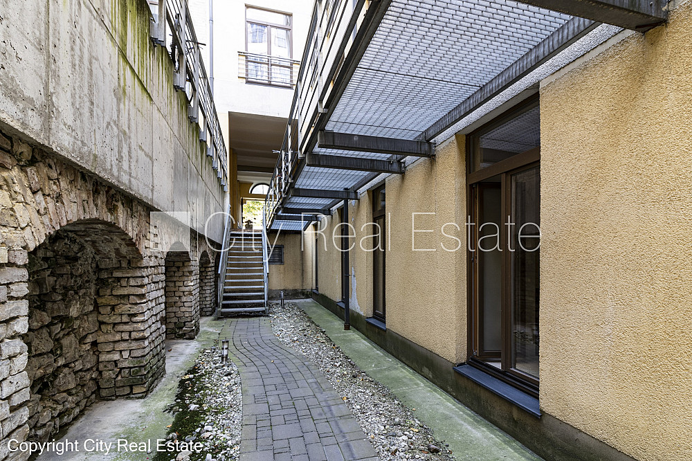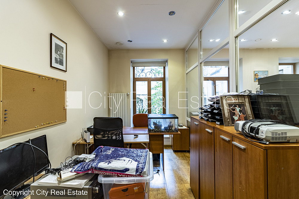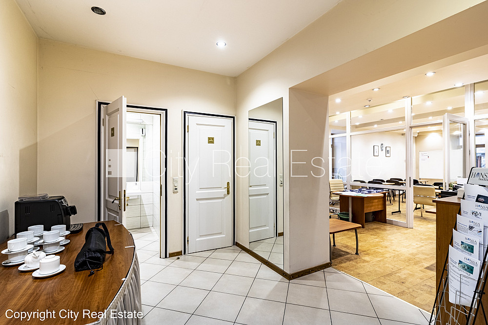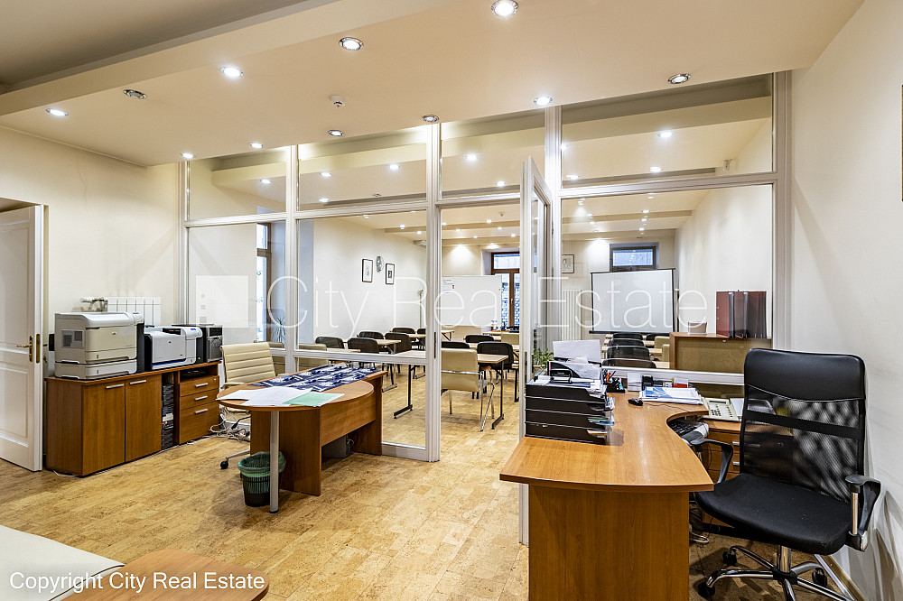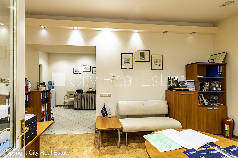 Zeme īpašumā, fasādes māja, renovēta māja, slēgts pagalms, ieeja no ielas, pirmais stāvs ar dārzu, cokolstāvs, ir lifts, kāpņu telpa pēc kapitālā remonta, logi vērsti uz pagalma pusi, telpas izolētas, palīgtelpa, augstie griesti, centrālā apkure, pilnā apdare, koka stikla pakešu logi, krāsotas sienas, jauna santehnika, parketa grīda, flīžu grīdas segums, sanitārais mezgls apvienots, dušas kabīne, tualete, iebūvēta virtuves iekārta, skapis, ledusskapis, elektriskā plīts, cepeškrāsns, tvaika nosūcējs, A klases biroju telpas, caurstaigājamas izolētas telpas, dūmu detektors, namrunis, diennakts videonovērošana, pārdod ar visu bildēs redzamo aprīkojumu, atbrīvo pēc nepieciešamības, reģistrēts zemesgrāmatā, par cenu iespējams vienoties, CITY REAL ESTATE ID - 510596