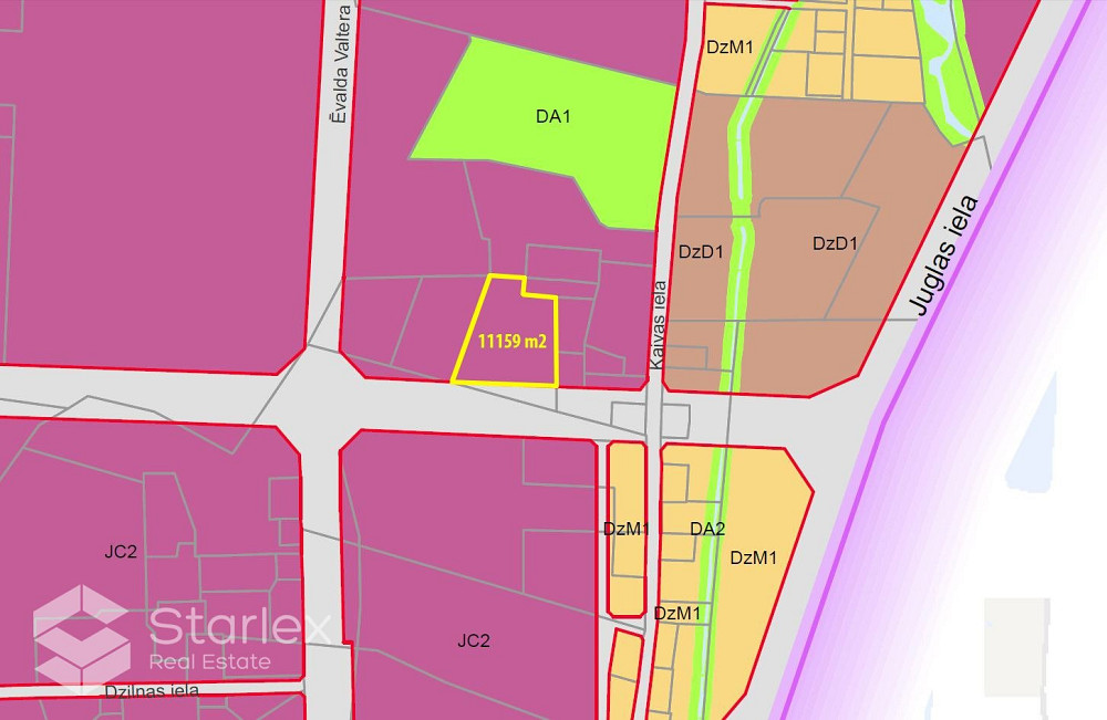 Saskaņā ar jauno Rīgas teritorijas plānojumu, zemes gabals atrodas Jauktas centra apbūves teritorijā (JC2), kur iespējama daudzveidīga gan dzīvojamā, gan komercobjektu apbūve (daudzdzīvokļu māju apbūve, biroju ēku apbūve, tirdzniecības vai pakalpojumu objektu apbūve u.c.). Maksimālā apbūves intensitāte - 220%. Brīvās zaļās teritorijas rādītājs komercobjektiem - 10%, dzīvojamā apbūvē - 40%. Apbūves augstums - līdz 6 stāviem.Gar zemes gabala robežu nesen izbūvēts Dzelzavas ielas pagarinājums līdz Juglas ielai, padarot īpašumu par fasādes gabalu.Zemes gabala apkārtnē notiek strauja attīstība - tiešā tuvumā atrodas nesen uzceltie tirdzniecības centri IKEA un SĀGA, jaunuzbūvētais "Lidl" loģistikas centrs, kā arī jaunā DEPO tirdzniecības centra apbūves laukums.