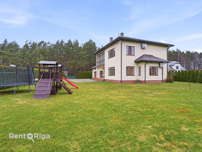 Izīrē privātmāju ar plašu dārza teritoriju! Ideāla vieta gan mierīgai ikdienas dzīvei, gan viesu uzņemšanai. Dārzā iespējams rīkot piknikus vai vienkārši baudīt atpūtu svaigā gaisā kopā ar ģimeni un draugiem. Plašā teritorija nodrošina privātumu un rada patīkamu, mājīgu atmosfēru. 1. stāvs. Ienākot mājā, kreisajā pusē ir plaša viesistaba, kas apvienota ar virtuvi un ir ēdamzonas vieta. No ieejas pa labi ir viena guļamistaba, saimniecības telpa, tualete un istaba mantu glabāšanai. No tās iespējams arī iekļūt garāžā. 2. stāvs. Uznākot pa kāpnēm, pirmās durvis kreisajā pusē ir plaša vannasistaba. Tālāk seko 4 atsevišķas guļamistabas. No "Master" guļamistabas izeja arī uz terasi. Papildu ērtības: + ~60m2 plaša garāža kur novietot 2 automašīnas + Terase ar saules marķīzi, kas izvelkas ~3,5m + Bērnu rotaļu laukums + Batuts Lūdzu, ņemiet vērā, ka mājai ir papildus vienreizēja aģentūras maksa, kas atbilst 50% no viena īres mēneša maksas. Interesē? Zvaniet un vienosimies par ērtāko laiku apskatei!