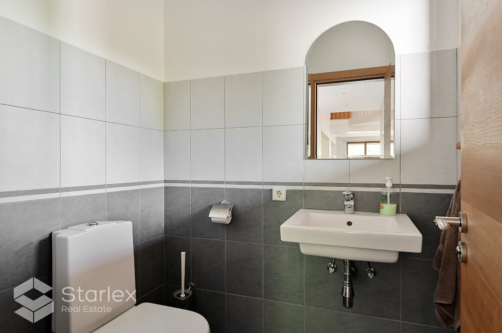 Dzīvojamajai mājai ir divi stāvi, 1.stāvā - plaša viesistaba, virtuves zona, kabinets, sanmezgls (duša, wc, džakuzi vanna), pirts un atpūtas telpa; 2.stāvā - 3 guļamistabas, garderobes telpa, 2 sanmezgli (viens ar dušu, otrs ar vannu un dušu).